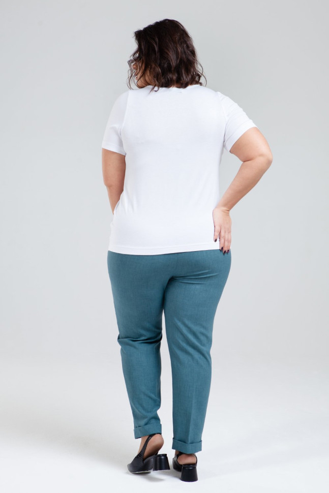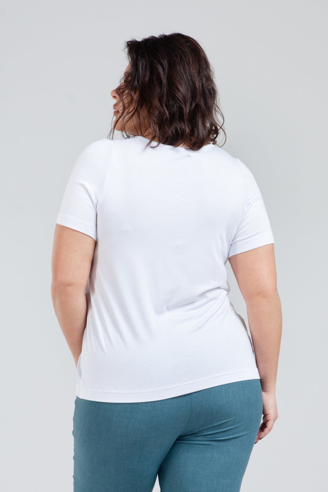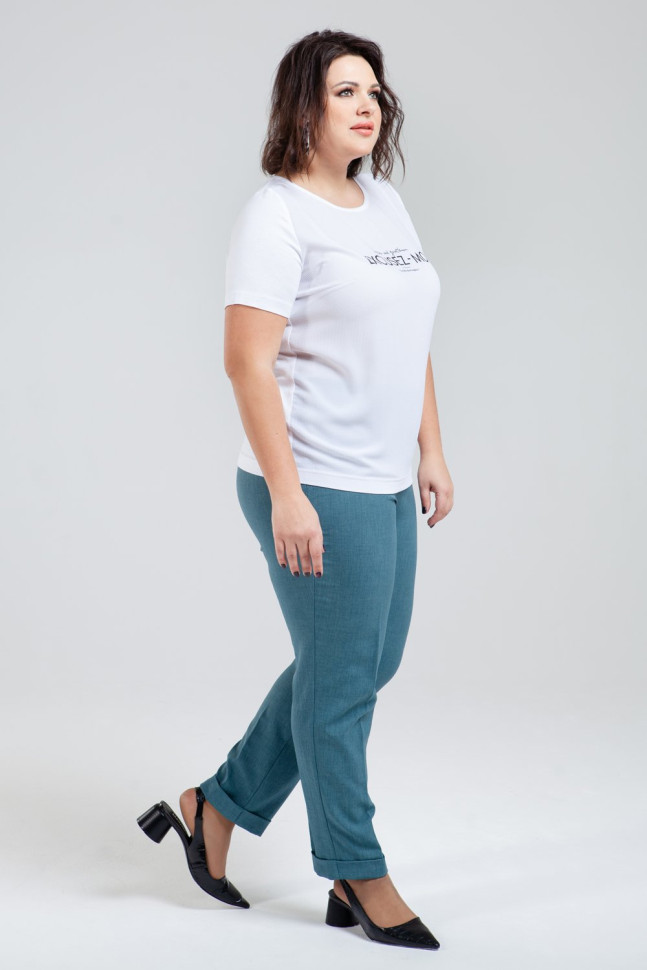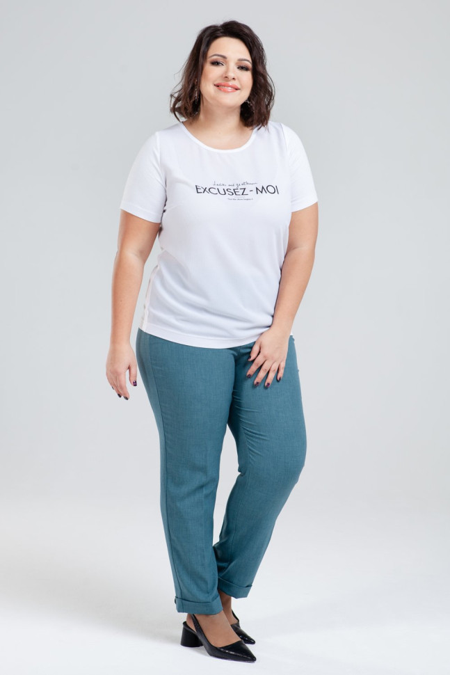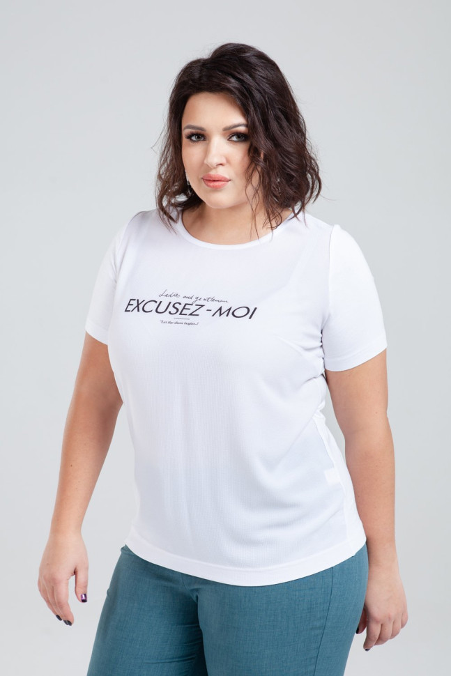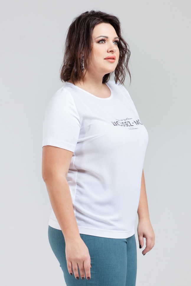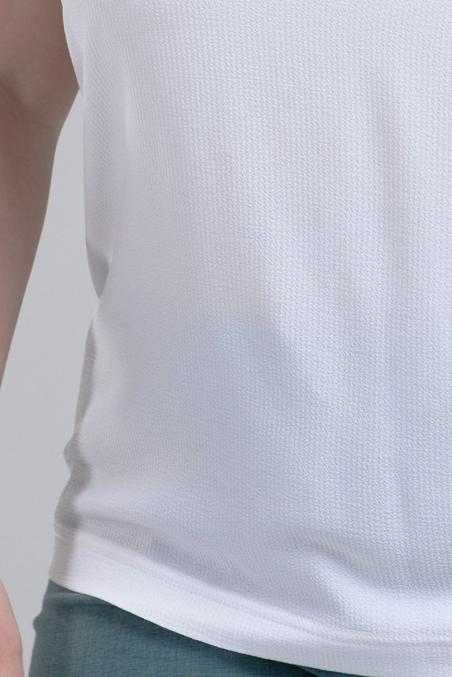 Модель свободного силуэта, выполнена из двух видов ткани: перед изделия выполнен из креп-шифона "Бабл", спинка из вискозы. Рукав втачной, короткий.