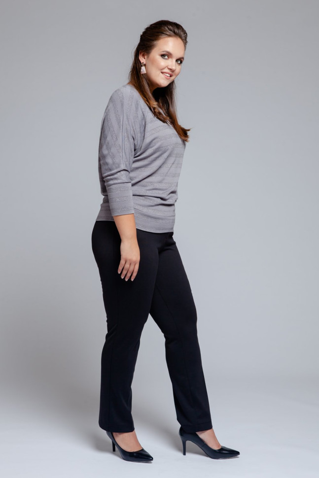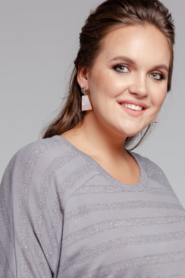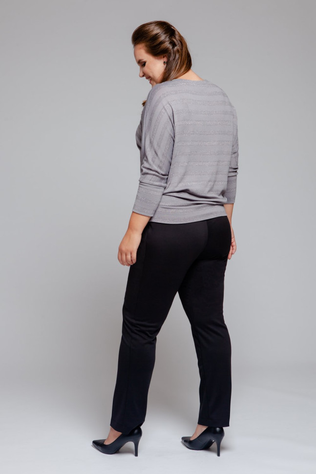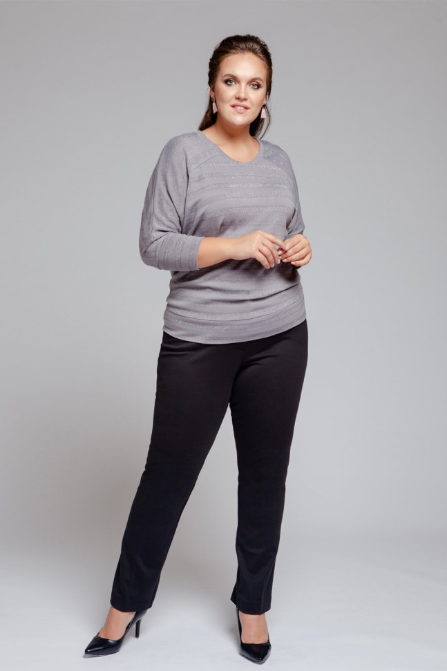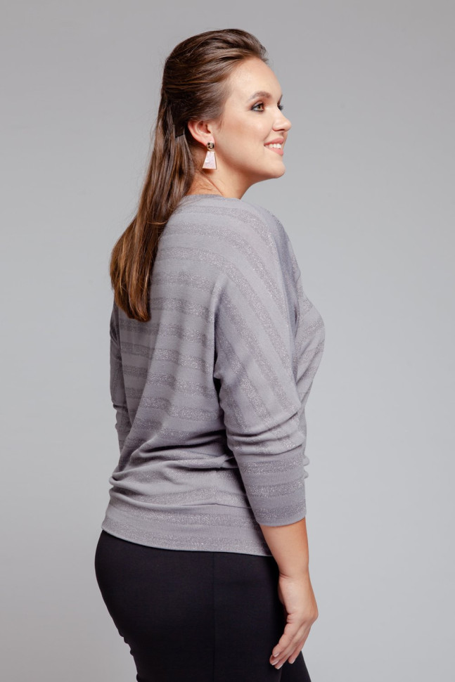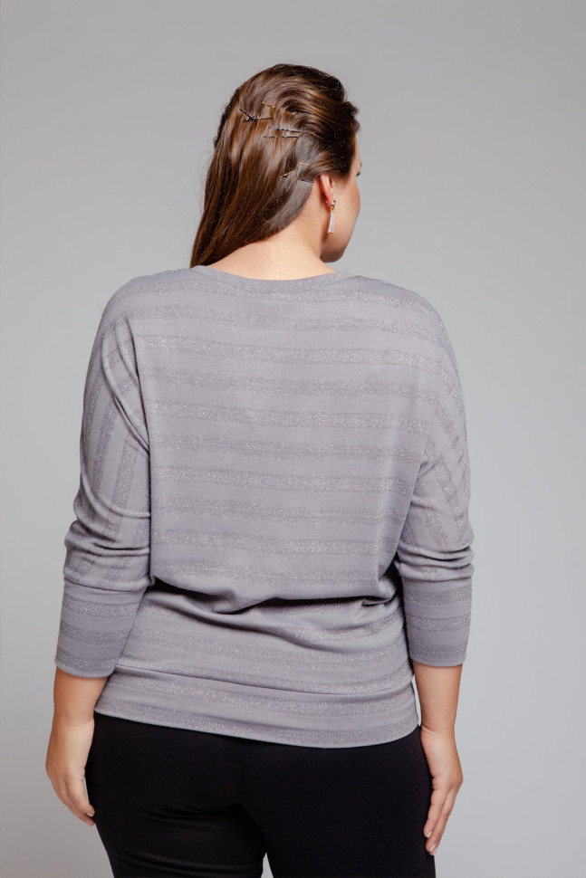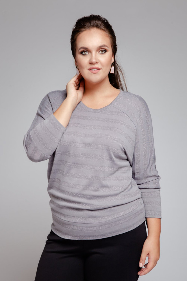 Трикотажная блуза с люрексом нежно-серого цвета в едва заметный рисунок-полоску. Круглый вырез горловины и рукав-регла обеспечит комфорт в носке.