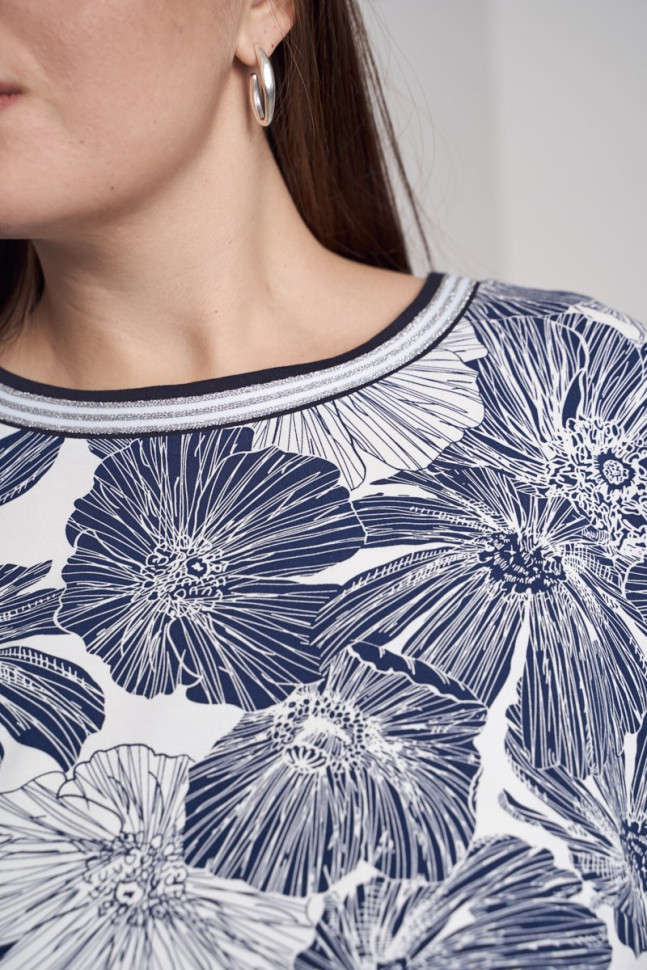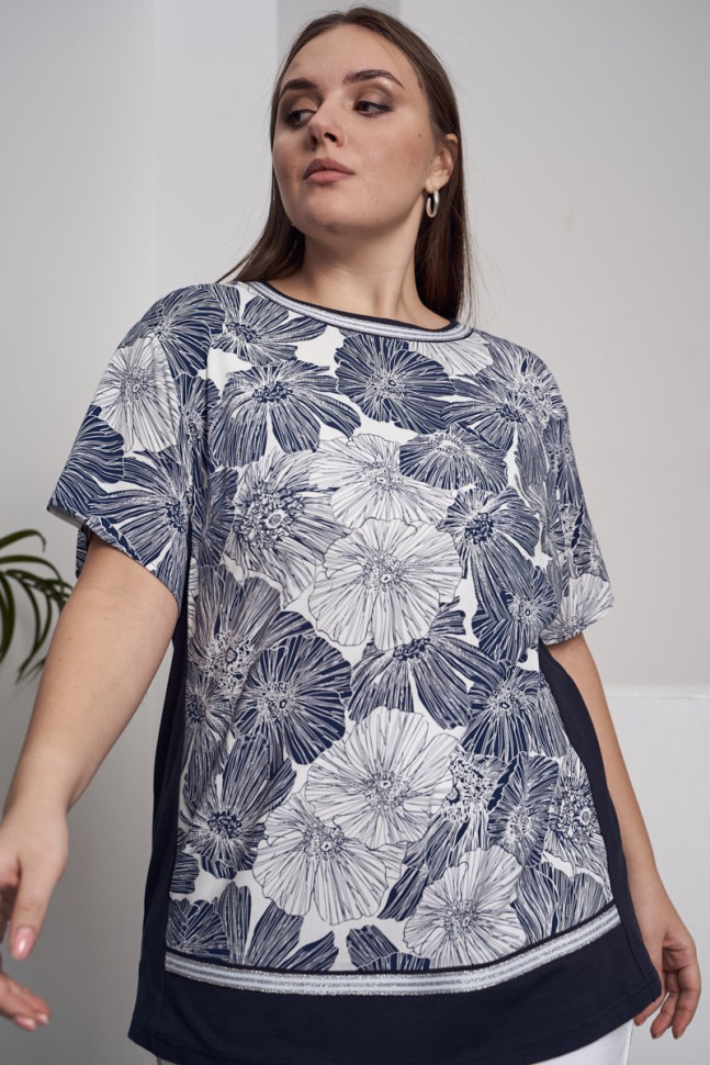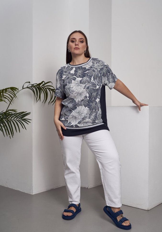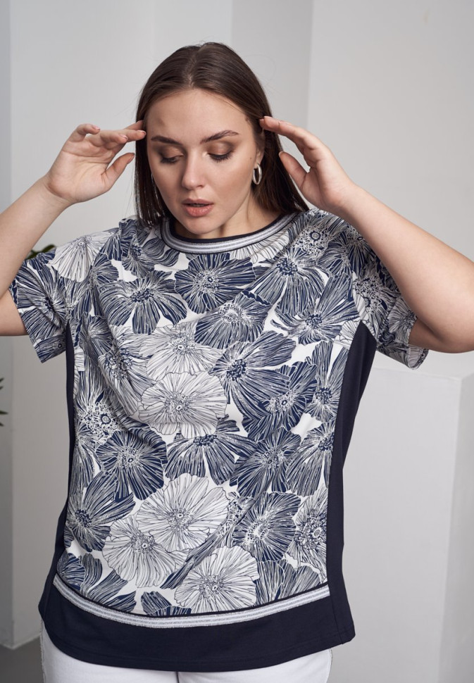 Блузка из вискозного полотна с эластаном. с отделкой из трикотажа и декоративной тесьмы. Трикотажные бочки стройнят и зрительно вытягивают фигуру. Длина блузки прикрывает зыбкие зоны. Длина изделия по спинке 71 см.