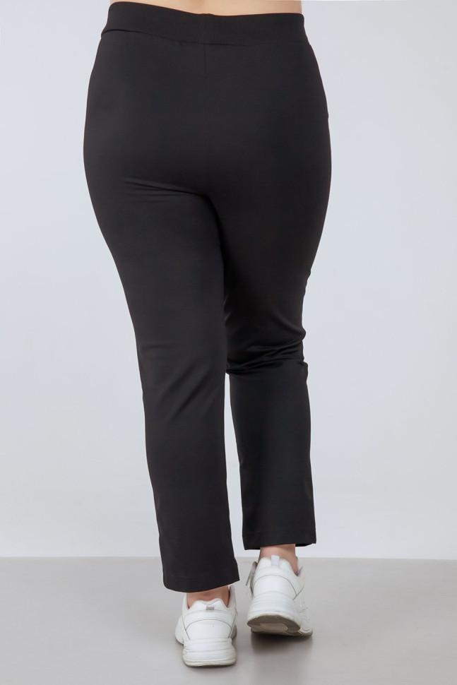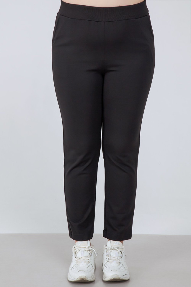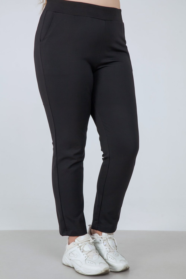 Прямые брюки выполнены из плотного трикотажного полотна. Пояс на широкой резинке. Имеются два действующих кармана.