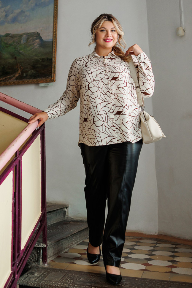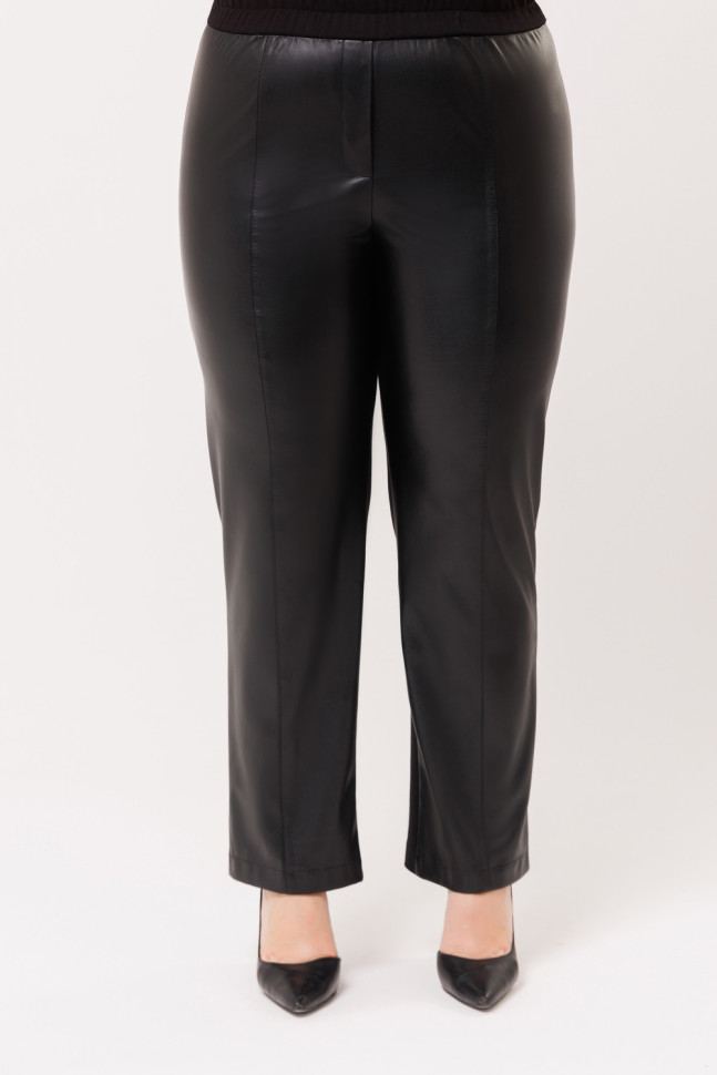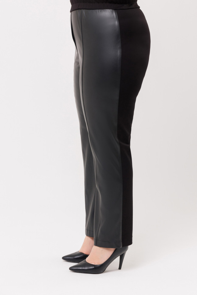 Слегка зауженные брюки выполнены из двух видов ткани: перед из экокожи, спинка - из трикотажного полотна. Пояс на резинке. Карманов нет.