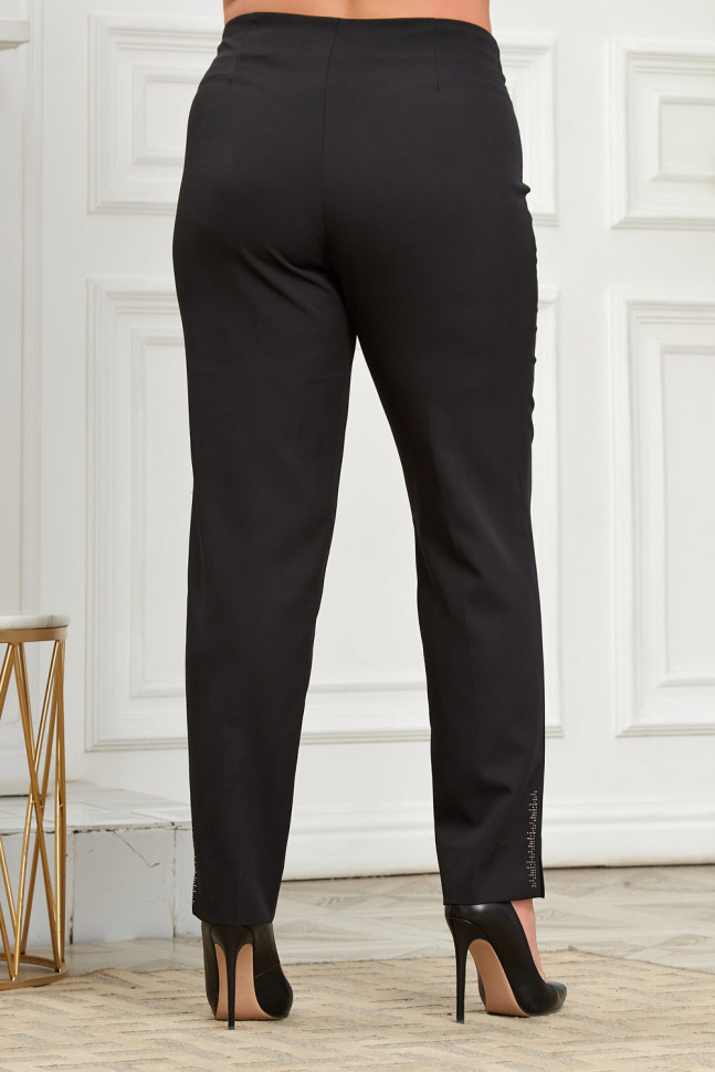 Брюки зауженные к низу, выполнены тз ткани "Барби". Пояс на обтачке. В боковом шве потойная молния. Внизу, с боку разрез . термоапликация из страз.