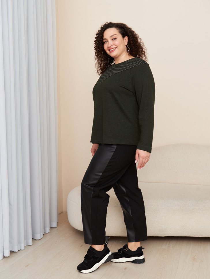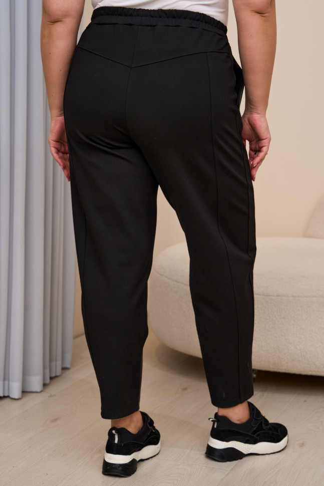 Экстраординарные брюки изготовлены из премиального материала с высоким содержанием вискозы и претендуют на роль самого трендового элемента женского гардероба при создании любого образа. Благодаря комбинировании двух тканей эко кожи и трикотажапозволит комфортно носить изделие на протяжении всего дня – это настоящая находка в гардеробе в демисезонную погоду. Детали: форма брюк «бананы», пояс на резинке без застежки, карман в шве, по спинке фигурная кокетка и рельефы.
