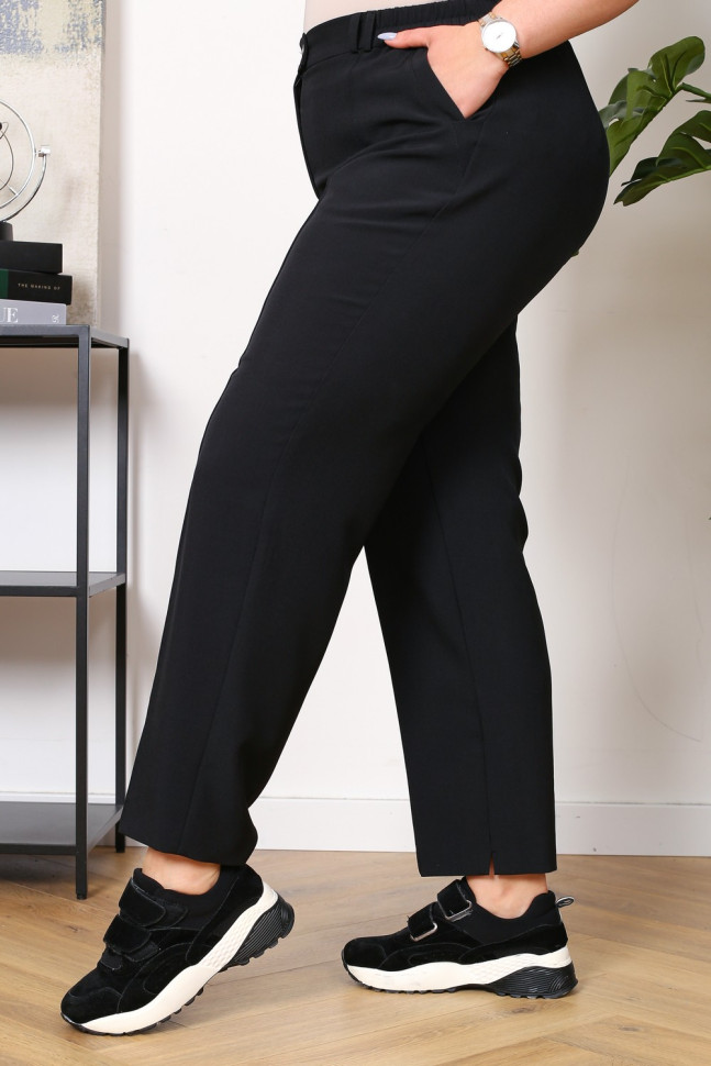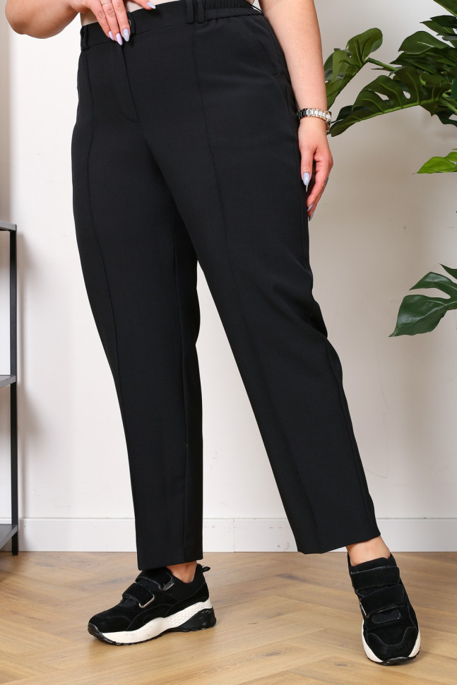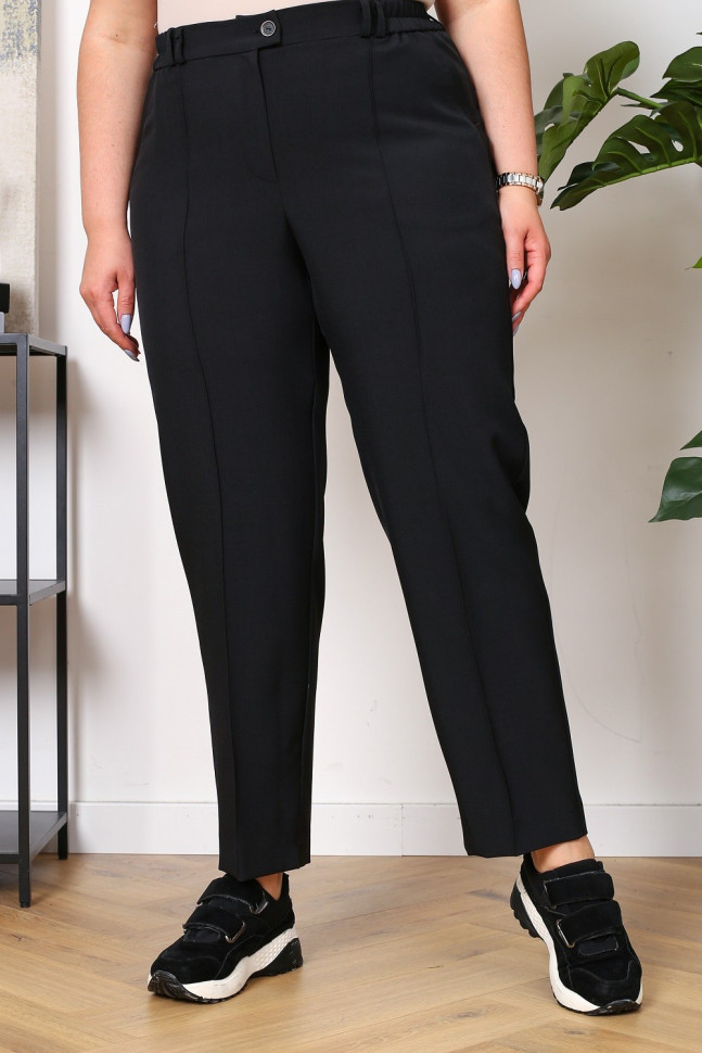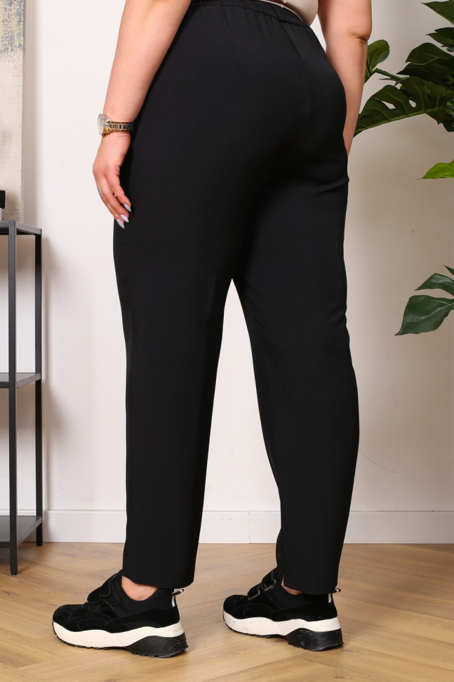 Базовые брюки для офисных и городских комплектов. Благодаря удобной посадке подходят разным типам фигуры. Плотность ткани подчеркивает достоинства и скрывает недостатки. Мягкость ткани подарит комфорт при носке. Детали: классический силуэт, по переду стрелки защипы, карманы по переду, разрезы по низу брюк, пояс частично на резинке, застежка на пуговице и гульфиком с молнией.