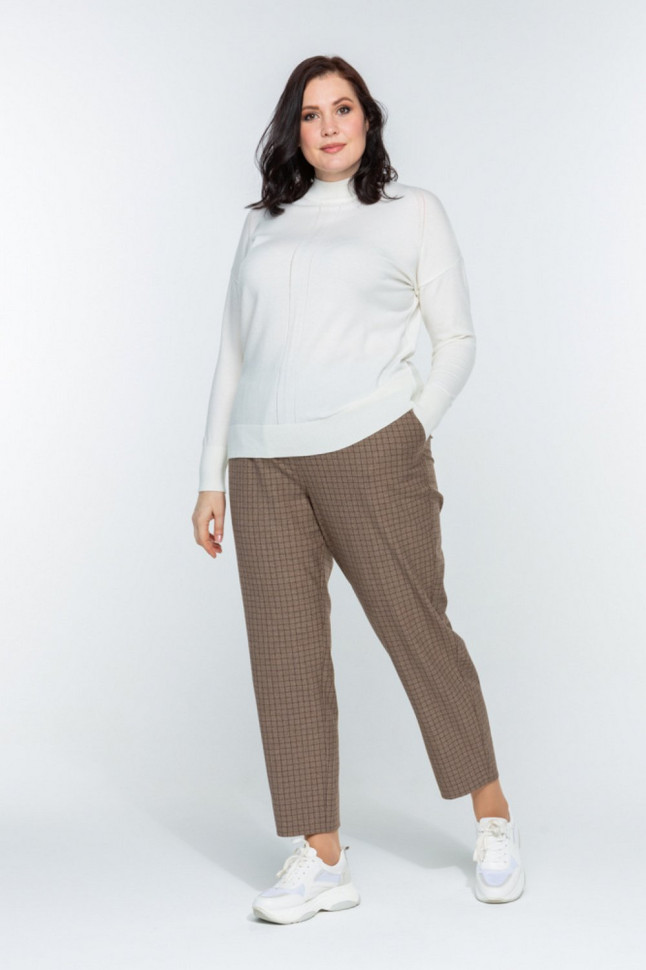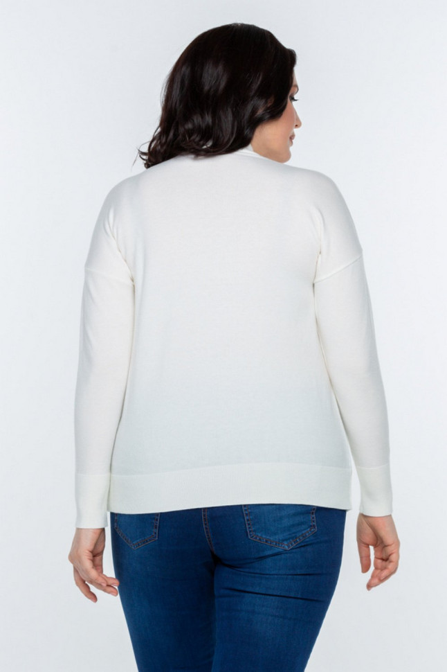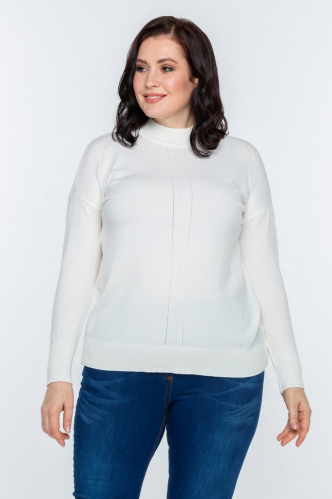 Уютный вязаный джемпер. Джемпер тонкой вязки из вискозной пряжи с небольшим добавлением кашемира, очень нежный и приятный к телу. Воротник, манжеты и низ изделия связаны в мягкую комфортную резинку. Вывязанная вертикаль по центру полочки деликатно удлинняет силуэт. Джемпер выполнен из пряжи с эффектом антипиллинга, то есть устойчивой к скатыванию. Изделие очень мягкое и эластичное, и станет комфортным выбором на каждый день для каждого типа фигуры.