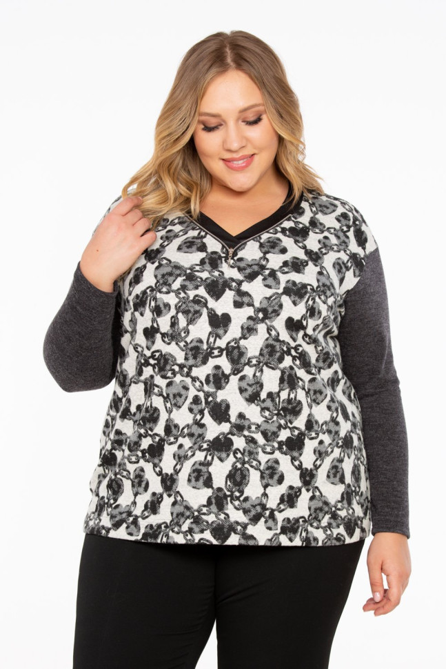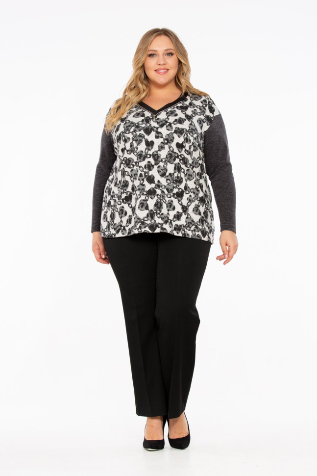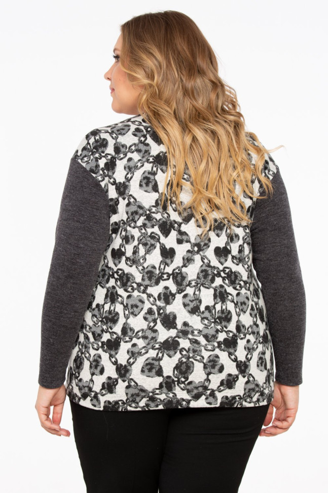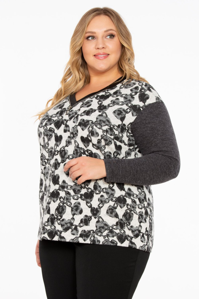 Оригинальный комфортный джемпер из трех видов трикотажа. V-образный вырез декорирован металлической молнией, оттененной планками из трикотажа с фактурой кожи. У модели удобный длинный рукав из серого меланжа. Этот джемпер великолепно сочетается с узкими или широкими брюками, джинсами, зауженными юбками любой длины.