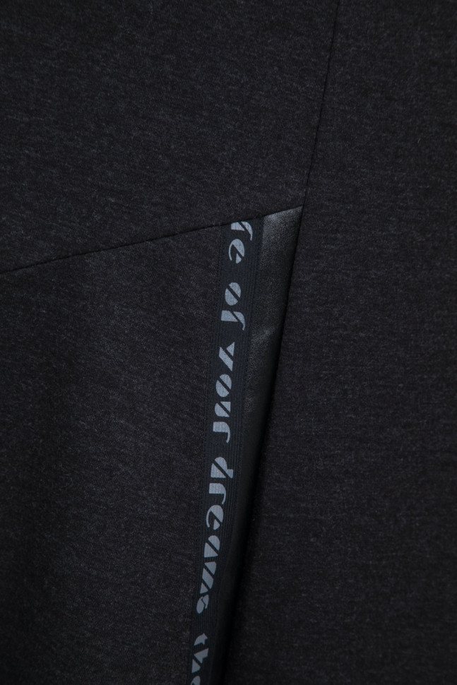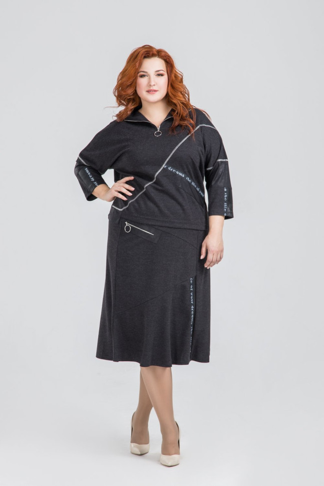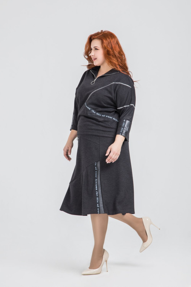 Юбка расклешена к низу. Фиксированный пояс оснащен резинками по бокам. На переднем полотнище декоративная молния, имитирующая карман. Весь комплект декорирован отделочными строчками и тесьмой с буквенным принтом. Идеальное решение для осени, не требующее долгого выбора сочетаний. Оцените комплекты 18301 и 74-140002-296.