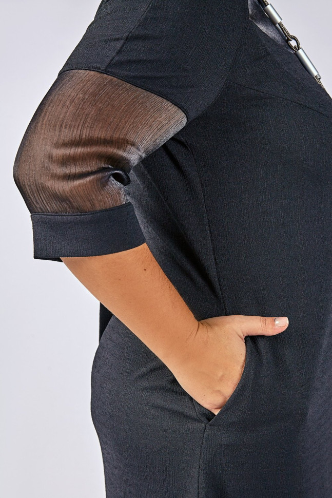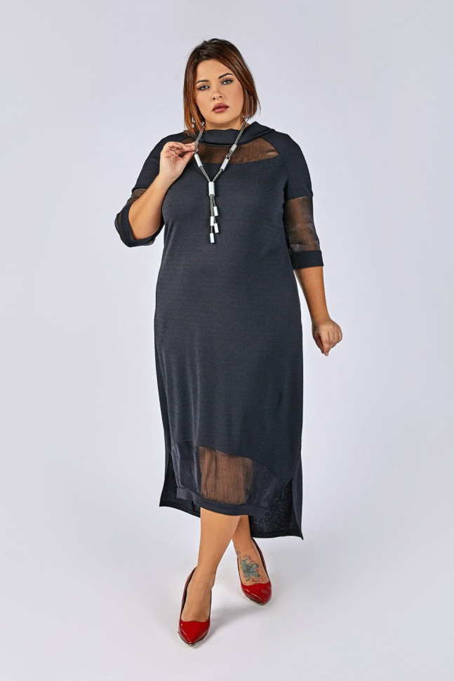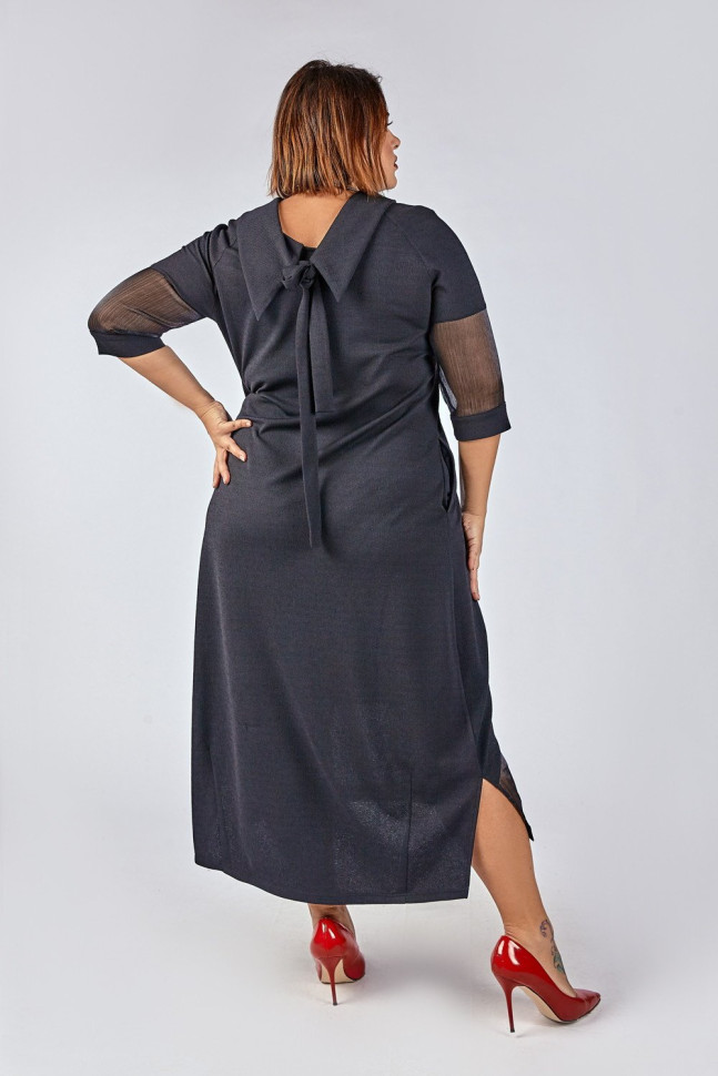 Платье полуприлегающего силуэта. Укороченный рукав. Дополнено полупрозрачными вставками из органзы. Длина изделия разноуровневая, разрезы по бокам. Воротник-хомут переходит в ленты-завязки на спинке. Дерзкое и одновременно строгое платье из микса двух фактур станет отличным вариантом для Вашего торжества! Состав 30% вискоза, 62% ПА, 8% эластан