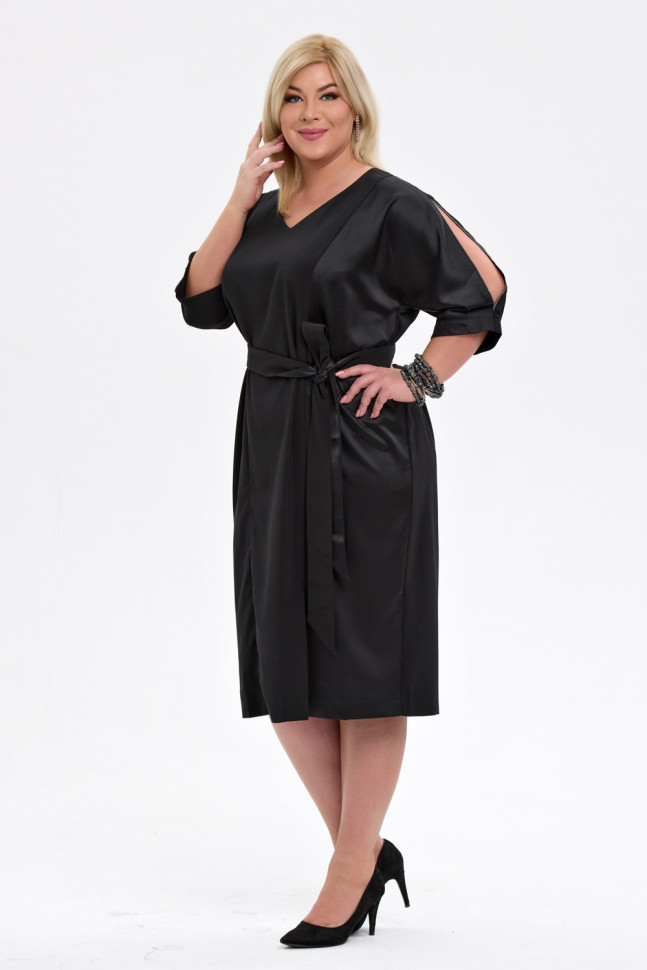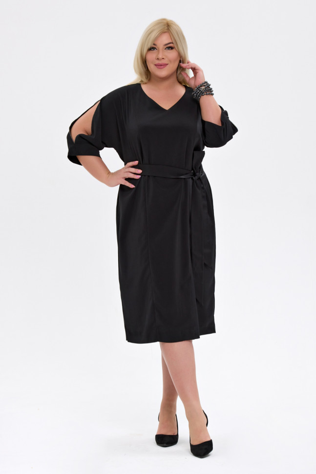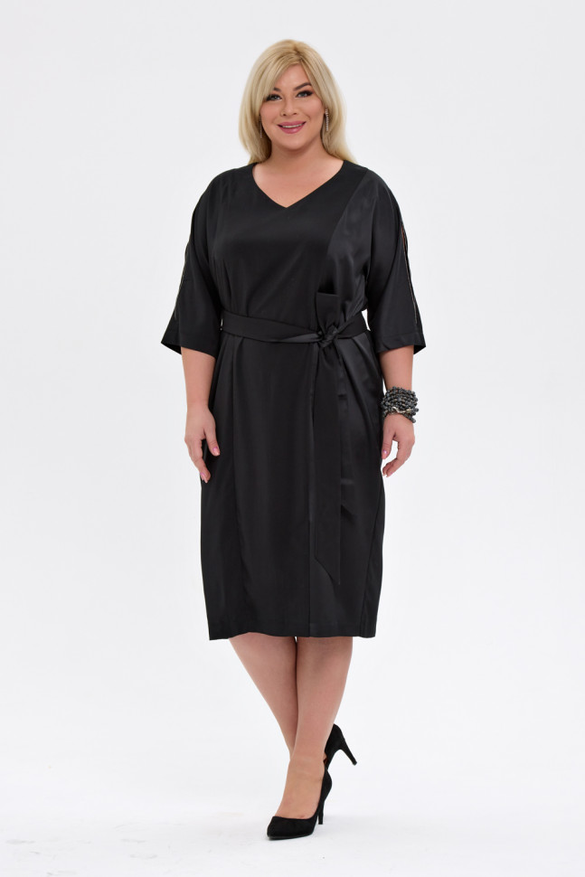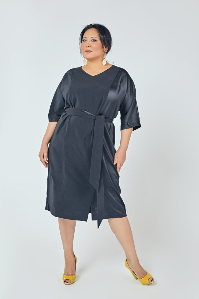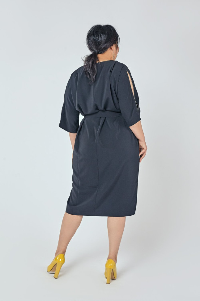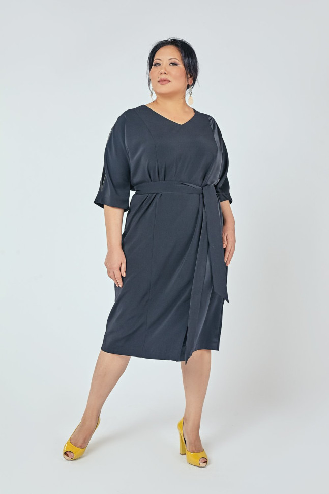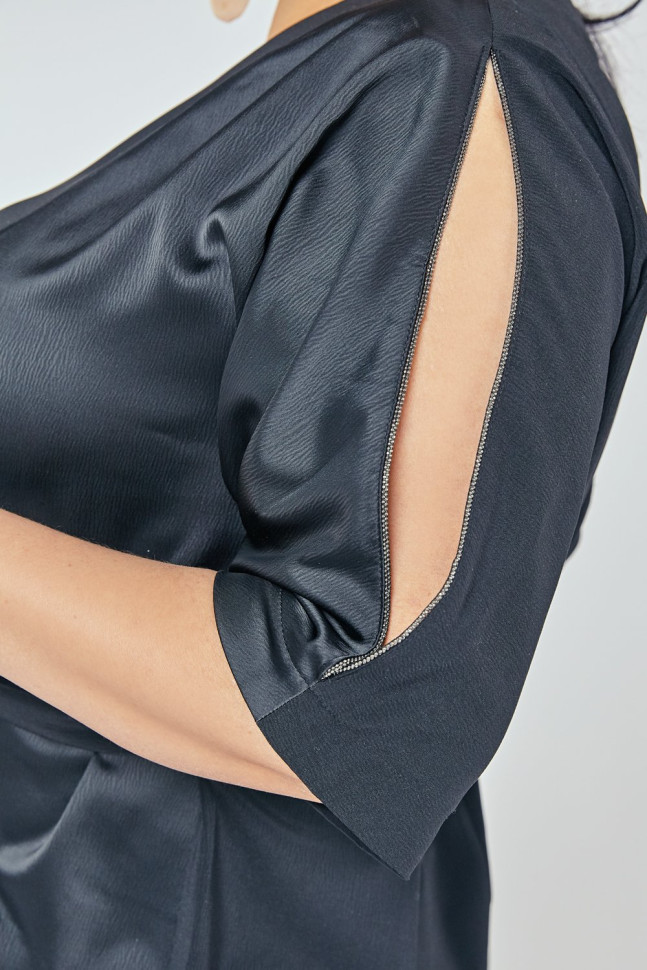 Платье полуприлегающего силуэта, выполнено из двух видов ткани. V-образный вырез горловины. Рукав цельновыкроенный, длина 3/4. В плечевых швах рукавов оставлены деликатные разрезы, декорированные металлизированной тесьмой. По переду разрез. По спинке средний шов. Состав 97% полиэстер, 3% эластан