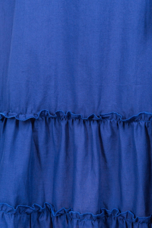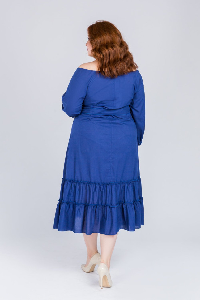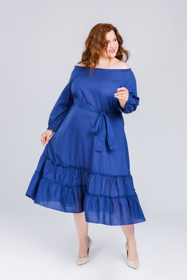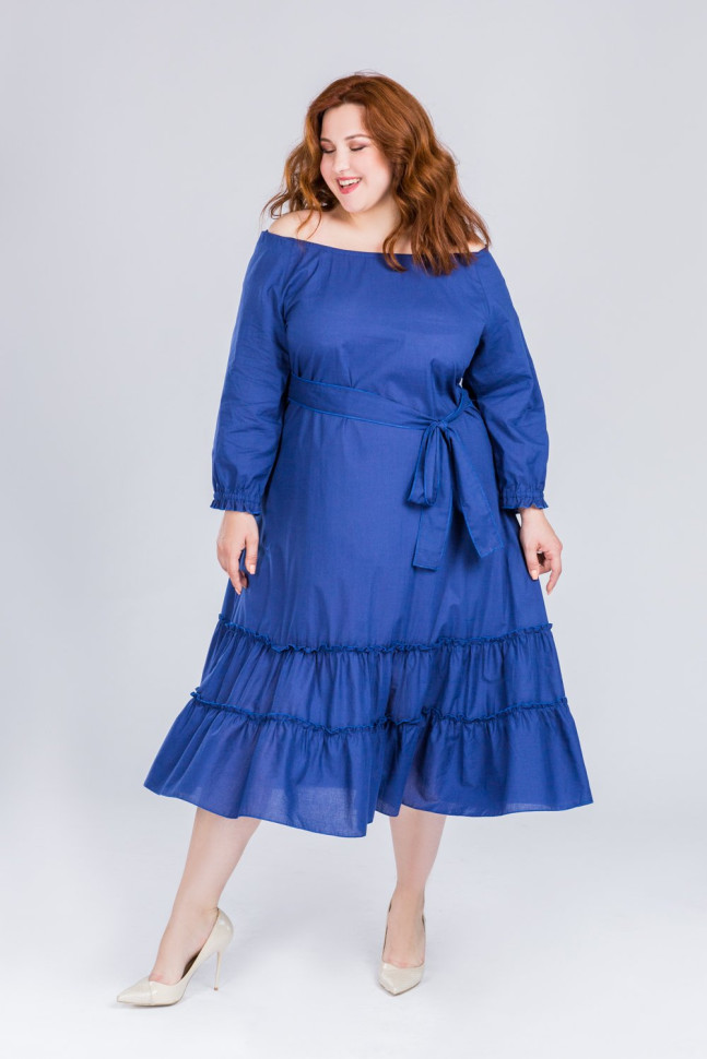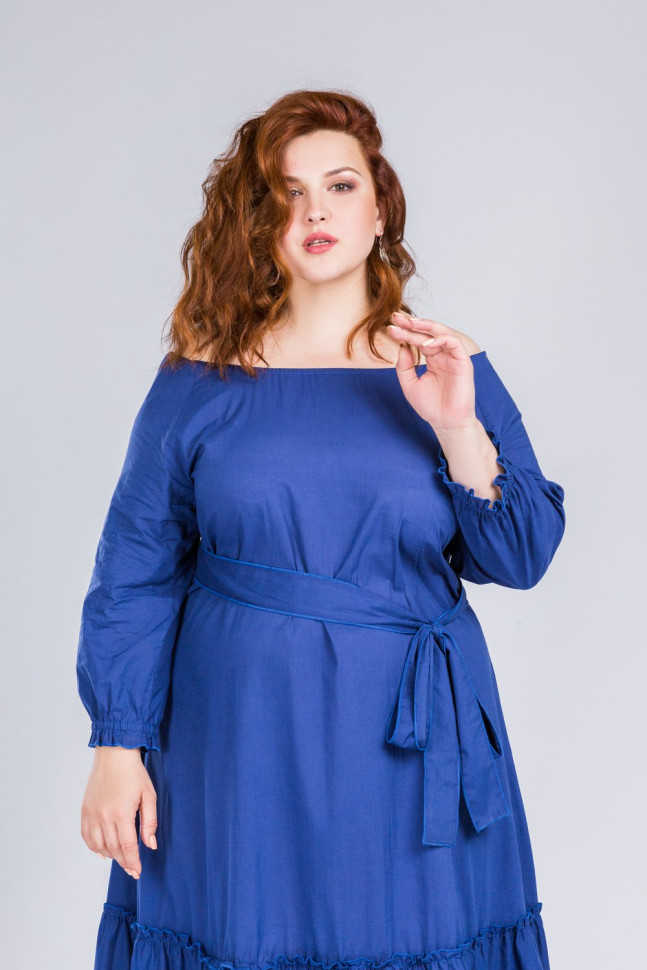 Хлопковое платье в синем цвете подчеркнёт вашу женственность и красоту. По низу платья крупные воланы, плечи открыты, есть пояс. Рукав длинный на манжете.