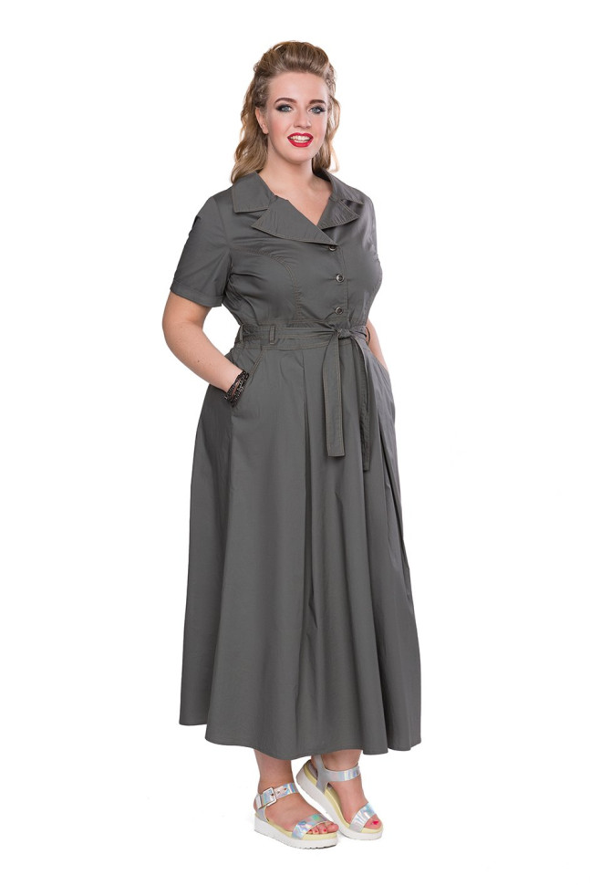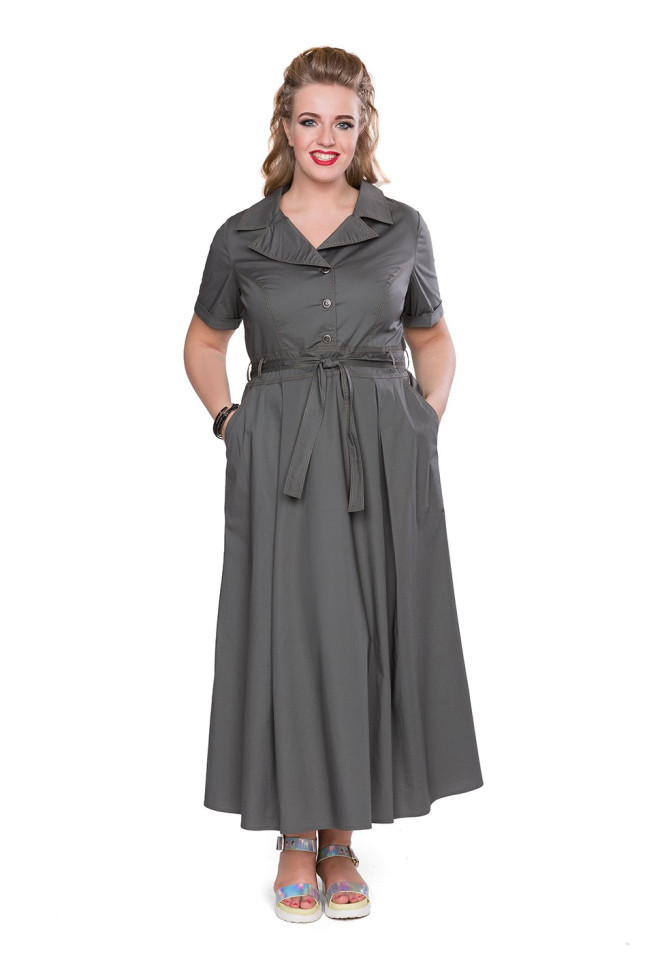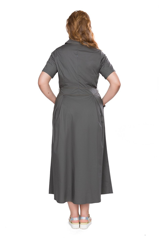 Приталенное платье-сафари из хлопковой ткани с добавлением эластана. Отложной воротник с широкими лацканами формирует V-образный вырез горловины и переходит в короткую застежку на пуговицы. Втачные рукава заканчиваются отворотами. Линия талии оформлена притачной планкой со шлевками, в которые можно продеть длинный пояс из комплекта. Пояс формирует женственный силуэт и красиво обрамляет талию. Юбка с односторонними мягкими складками отлично держит форму и струится по фигуре. На спинке скрыта застежка на потайную молнию. В боковых швах юбки - функциональные карманы. С ними платье становится более практичным. Стиль Сафари эффектно врывается в городской ландшафт, ярко выделясь среди бетонных стен.