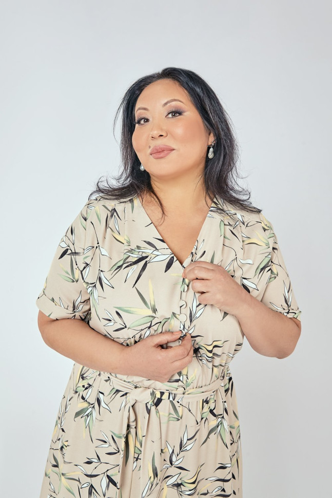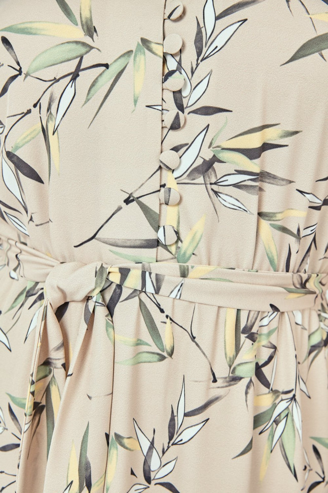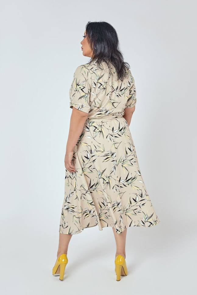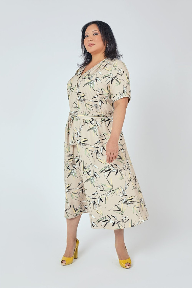 Модель силуэта трапеция. Вырез горловины Vобразный. Рукав втачной, длины до локтя, низ на манжете. Отрезная линия талии на резинке. По спинке кокетка и средний шов. Состав 65% вискоза, 30% полиэстер. 5% лайкра