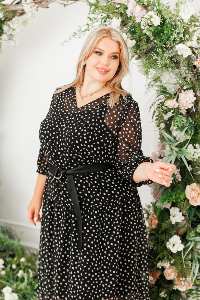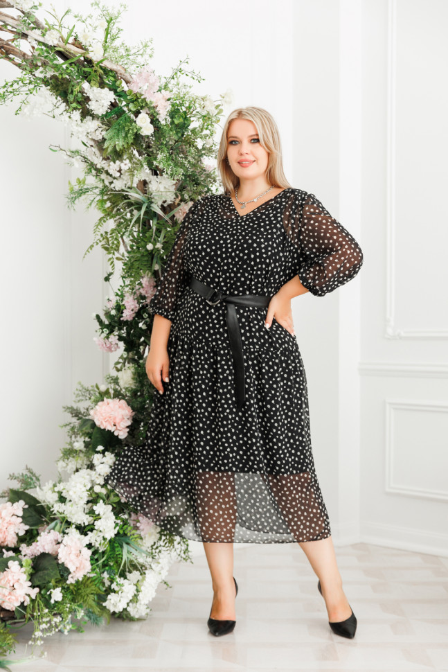 Изделие силуэта "трапеция" выполнено из шифона. Вырез горловины V- образный. Рукав втачной, низ на резинке. Длина за локоть. Заниженная линии талии. Низ модели закончен широким воланом на сборке. Платье дополнено платьем-чехлом и съемным поясом.