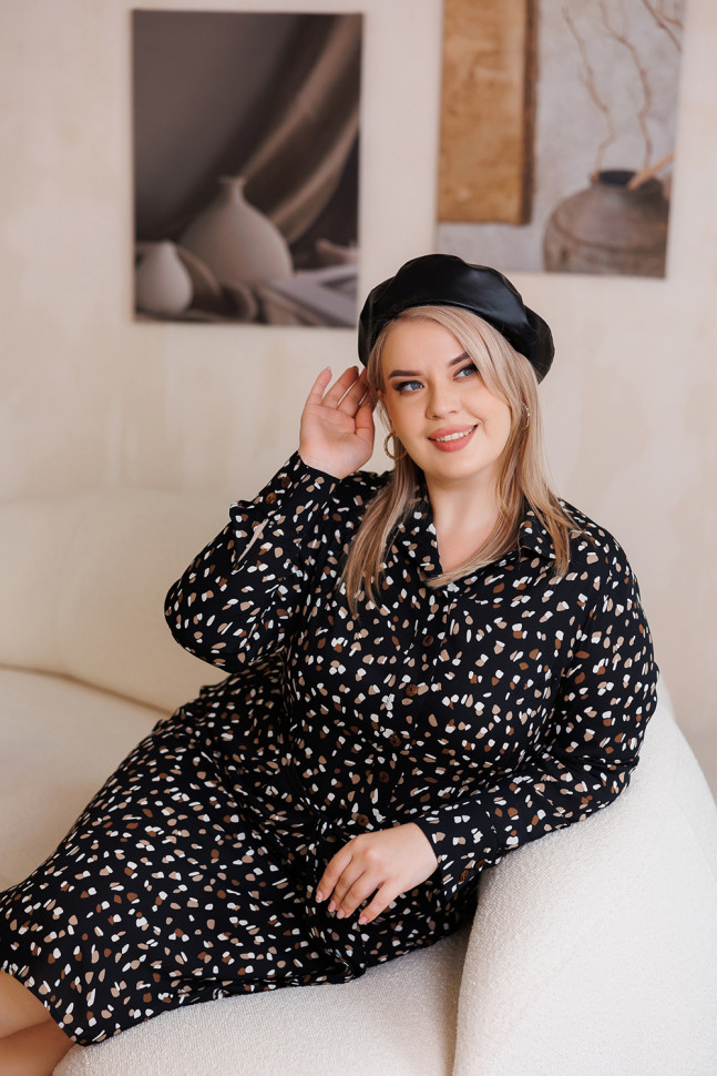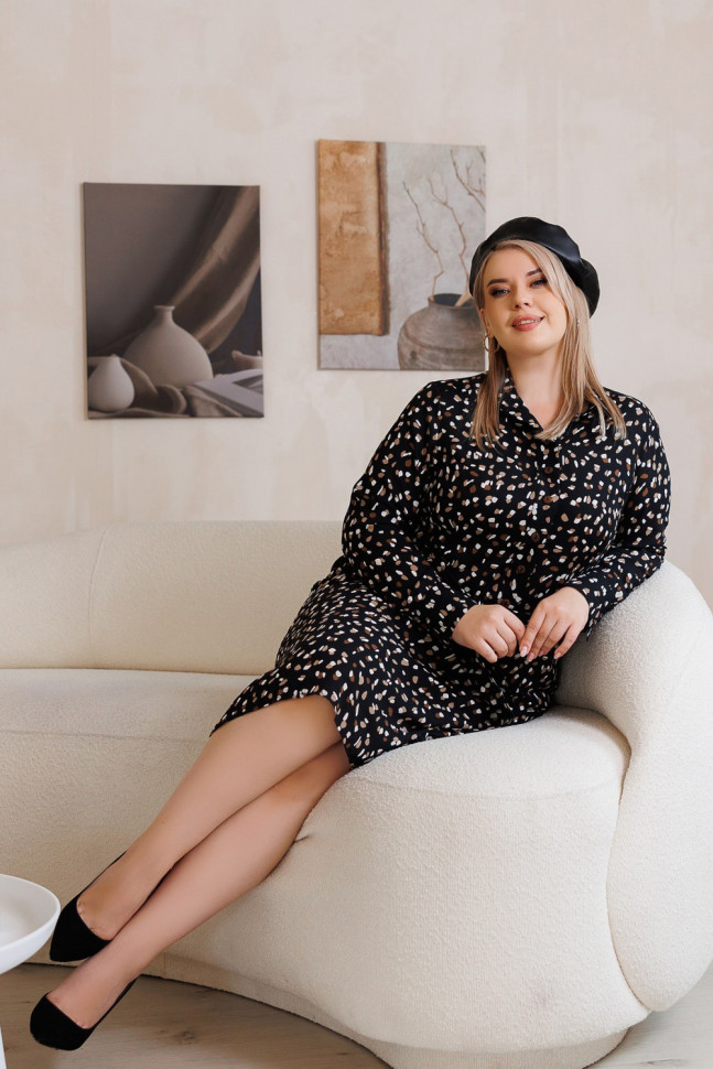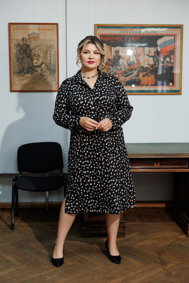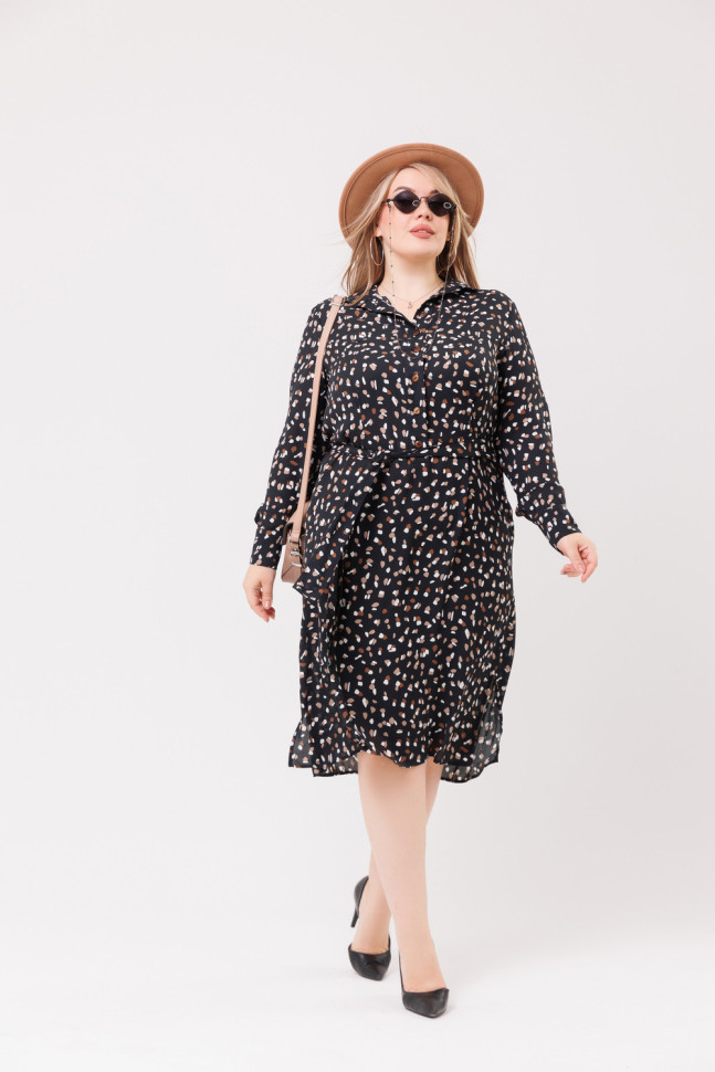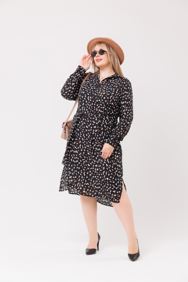 Изделие прямого силуэта выполнено из шифона. Воротник отложной. Рукав втачной, длинный, на манжете. По переду и спинке талиевые складки. По боковым швам, внизу, разрезы. По центру, до линии талии, супатная застёжка. Модель дополнена съёмном поясом.