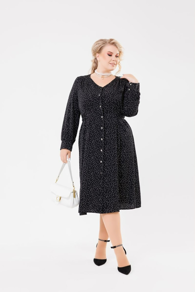 Изделие свободного силуэта выполнено из плательной ткани. Вырез горловины V - образный. Рукав втачной, длинный, на манжете. "Кокетка" на сборке. По центру полочки застёжка на пуговицы. Имеется втачной пояс.