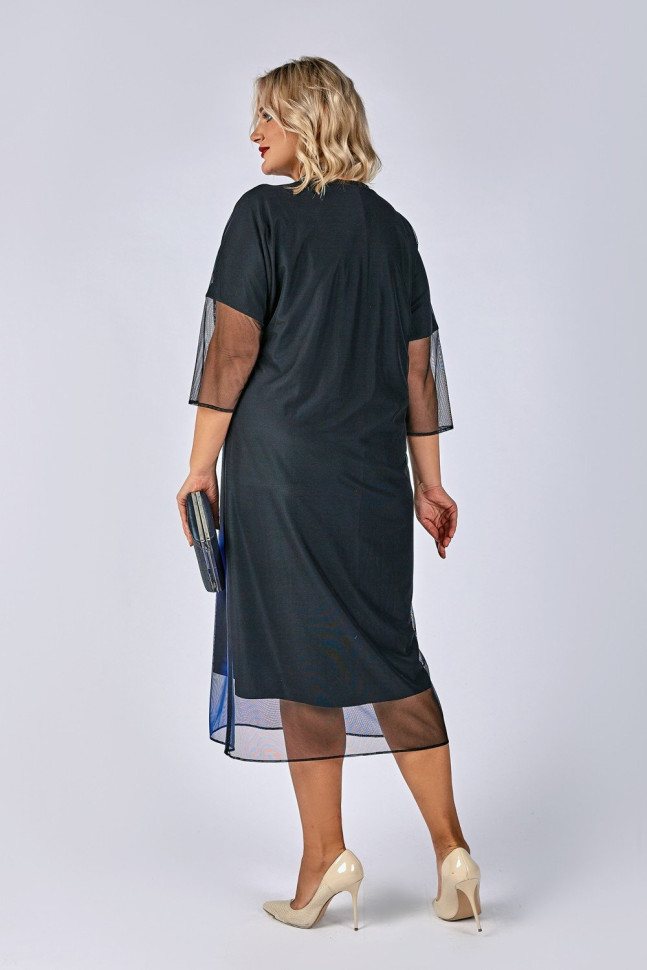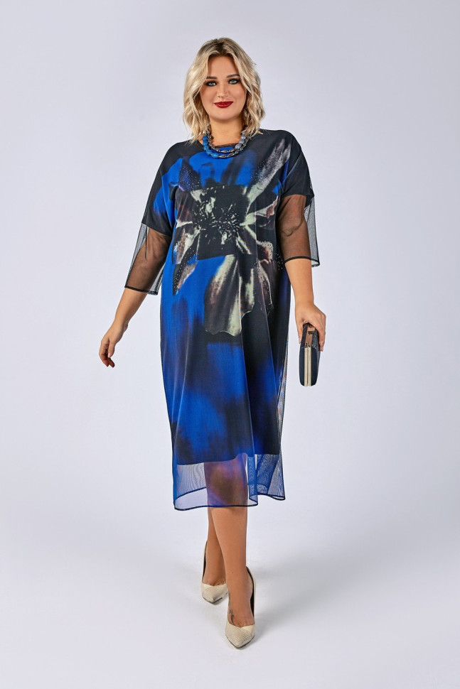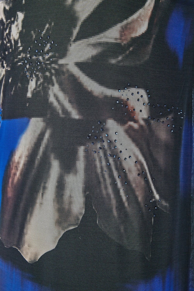 Двухслойное платье выполнено из двух видов ткани. Верхнее платье выполнено из сетки с дизайнерским принтом и продекорировано стразами. Вырез горловины круглый. Спущенное плечо. Прекрасный выбор для создания вечернего образа. Состав нижнего платья 50% Вискоза, 45% ПЭ, 5% Лайкра. Состав верхнего платья 100% Полиэстер