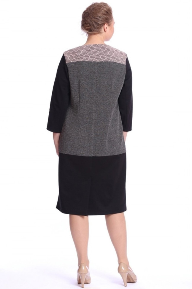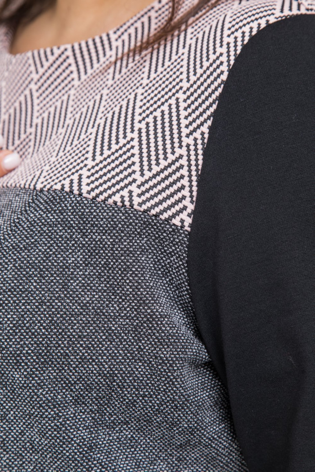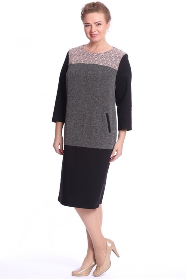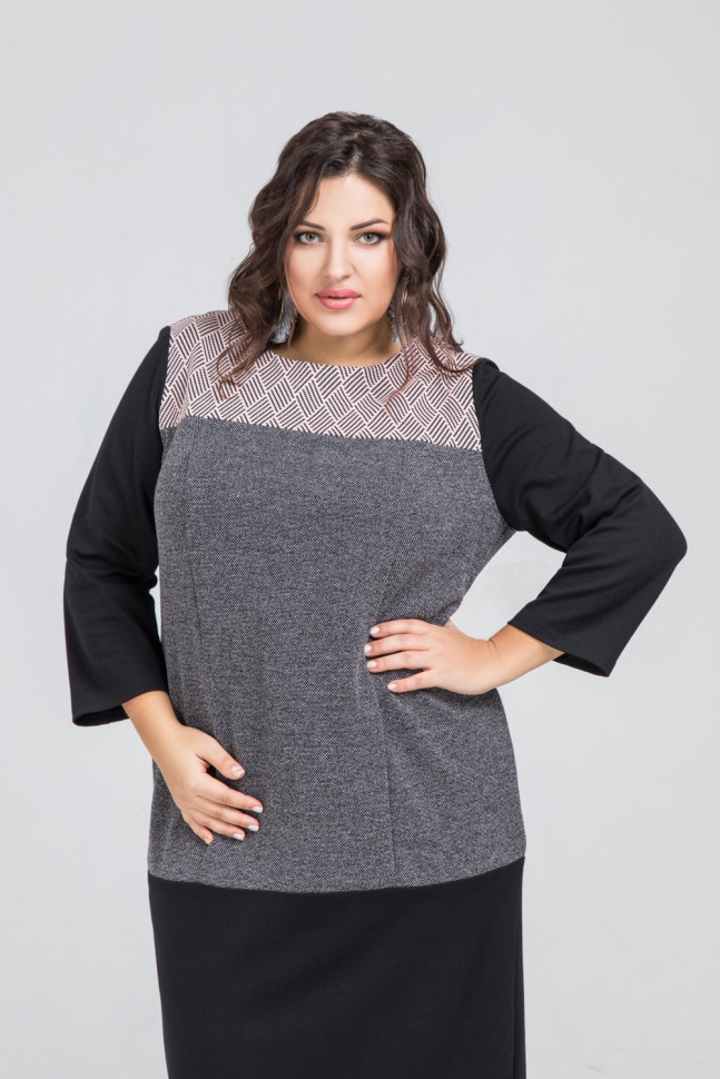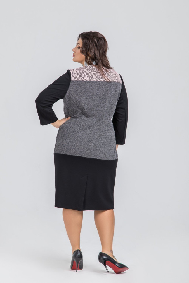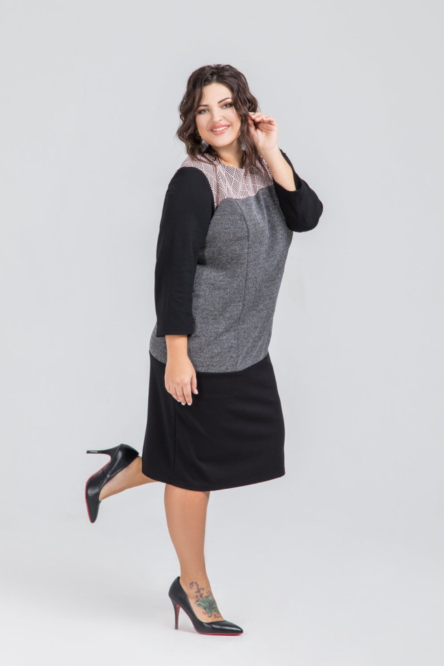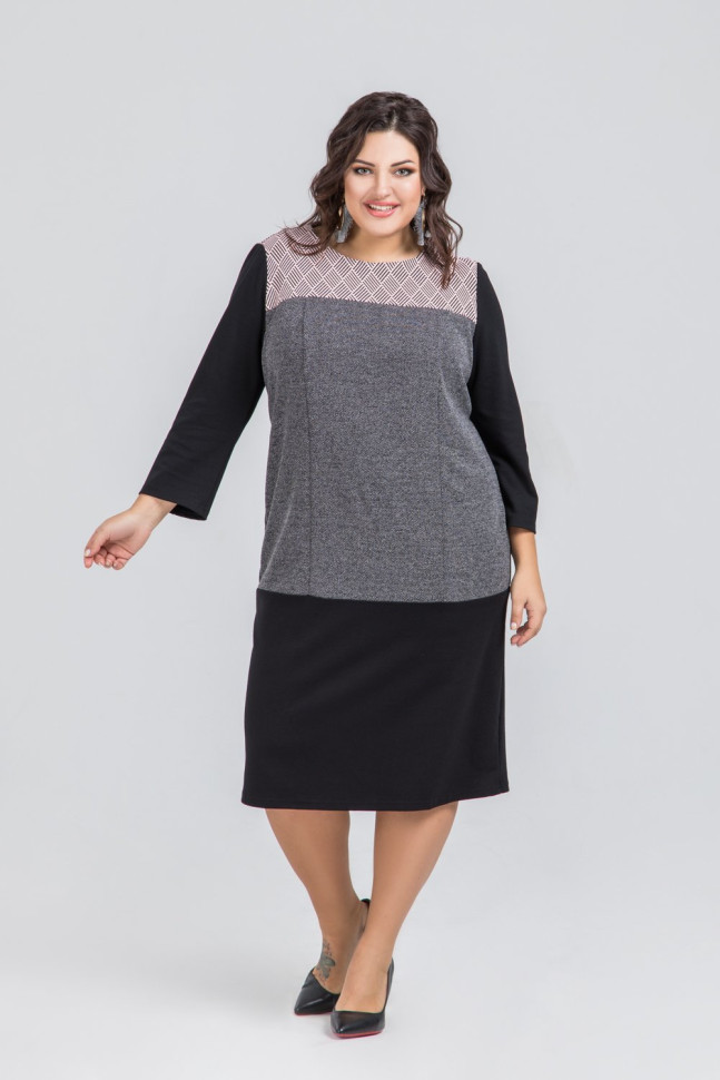 Платье средней длины из трех видов ткани с укороченным рукавом. Горизонтальное деление фигуры не полнит, а подчеркивает достоинства. Прореные карманы по бокам, декорированные листочкой, делают силуэт стройнее
