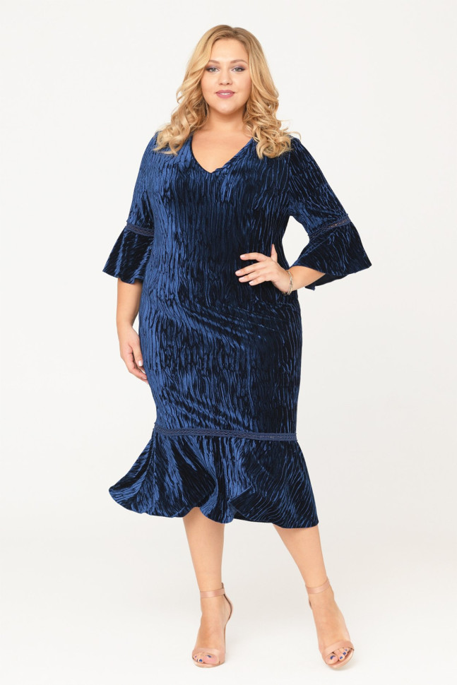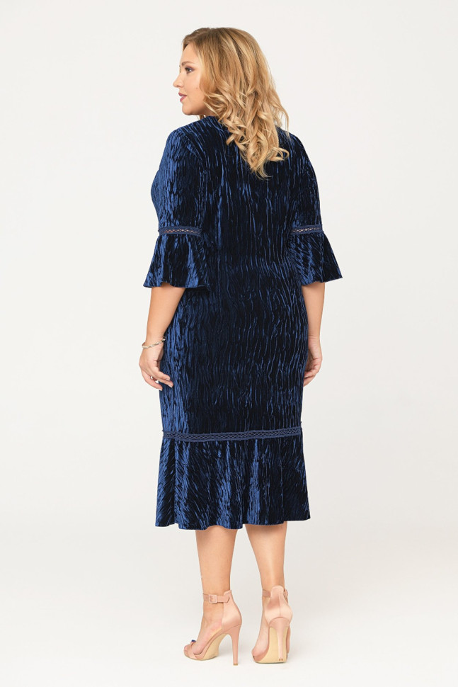 Нарядное платье полуприлегающего силуэта из эластичного бархата "крэш". V-образный вырез деликатно подчеркивает зону декольте. Подол платья и втачные рукава длиной 3/4 декорированы широкими воланами и плетеным кружевом. Глубокий синий переливается в фактуре бархата и создает роскошное сияние.