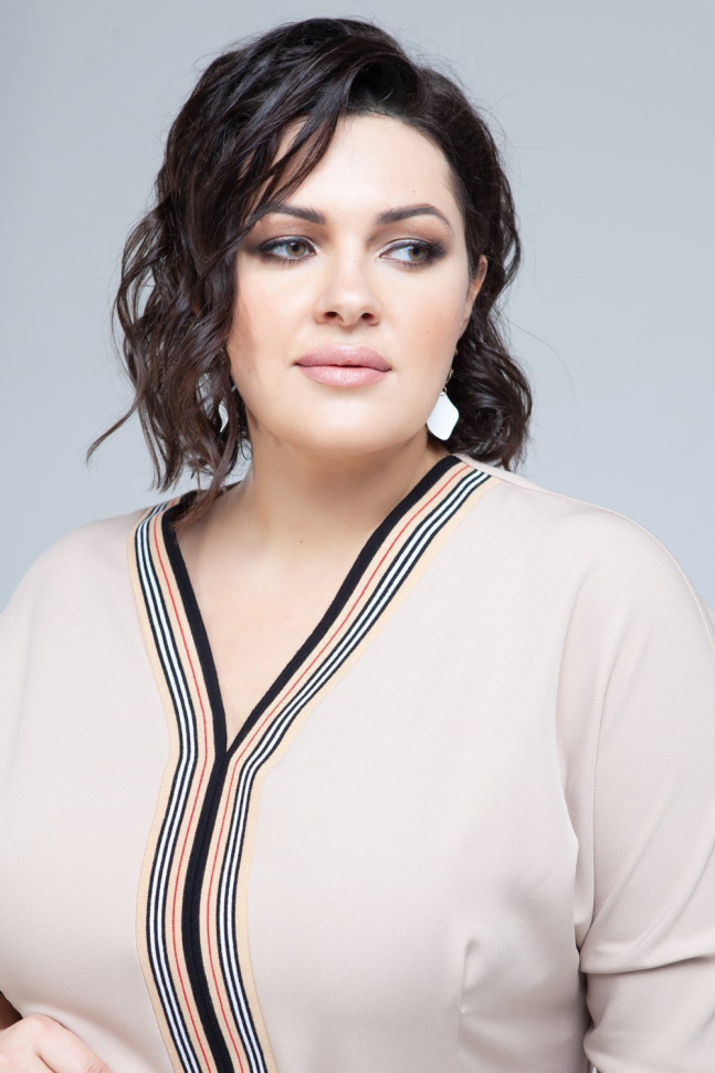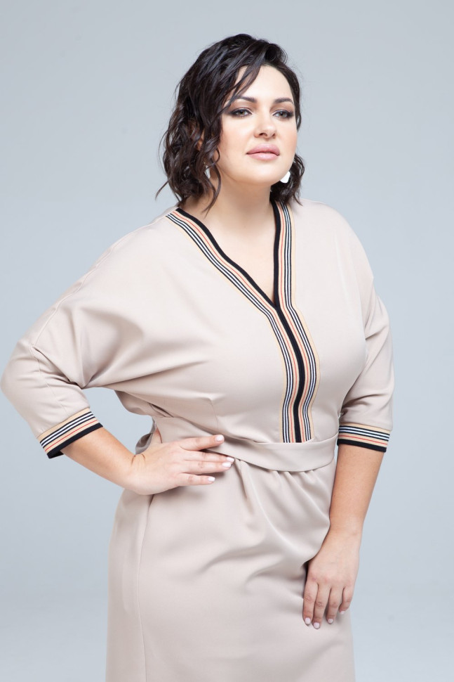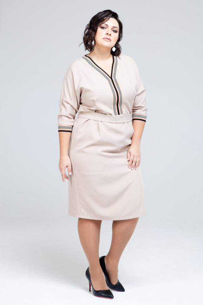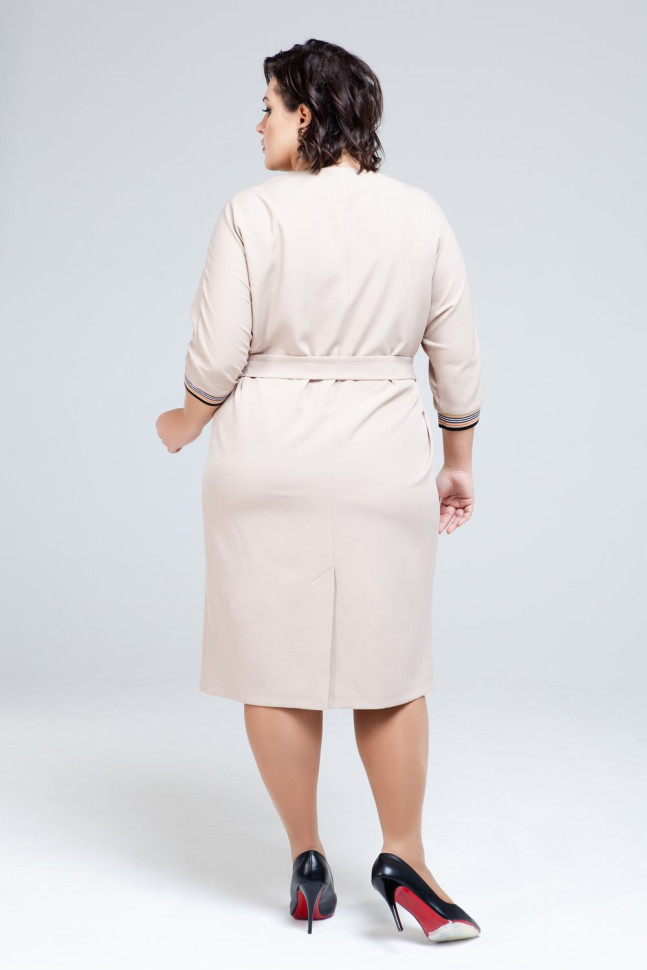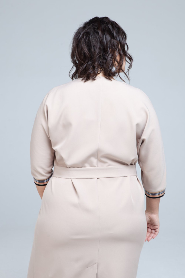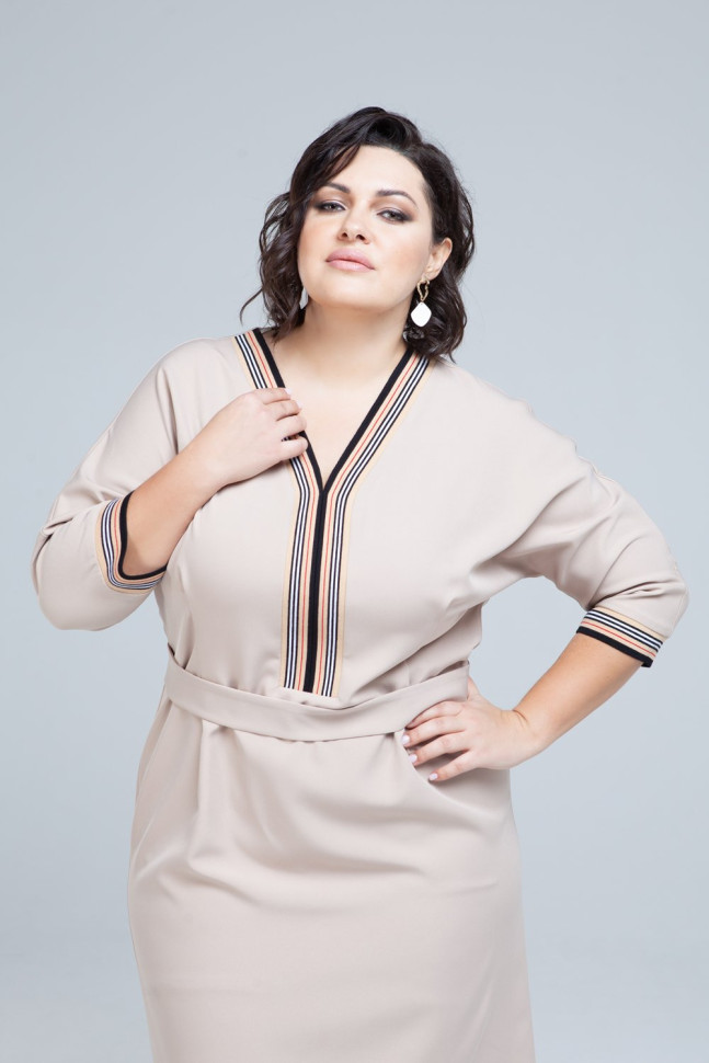 Платье-футляр светло-бежевого оттенка подчеркнет женственность и достоинства фигуры. V-образный вырез горловины и манжеты рукавов обтачены контрастной полосатой резинкой. Тканевый пояс с металлической пряжкой идет в комплекте.