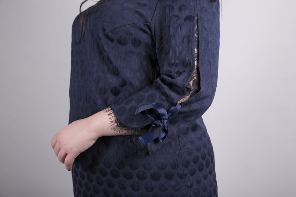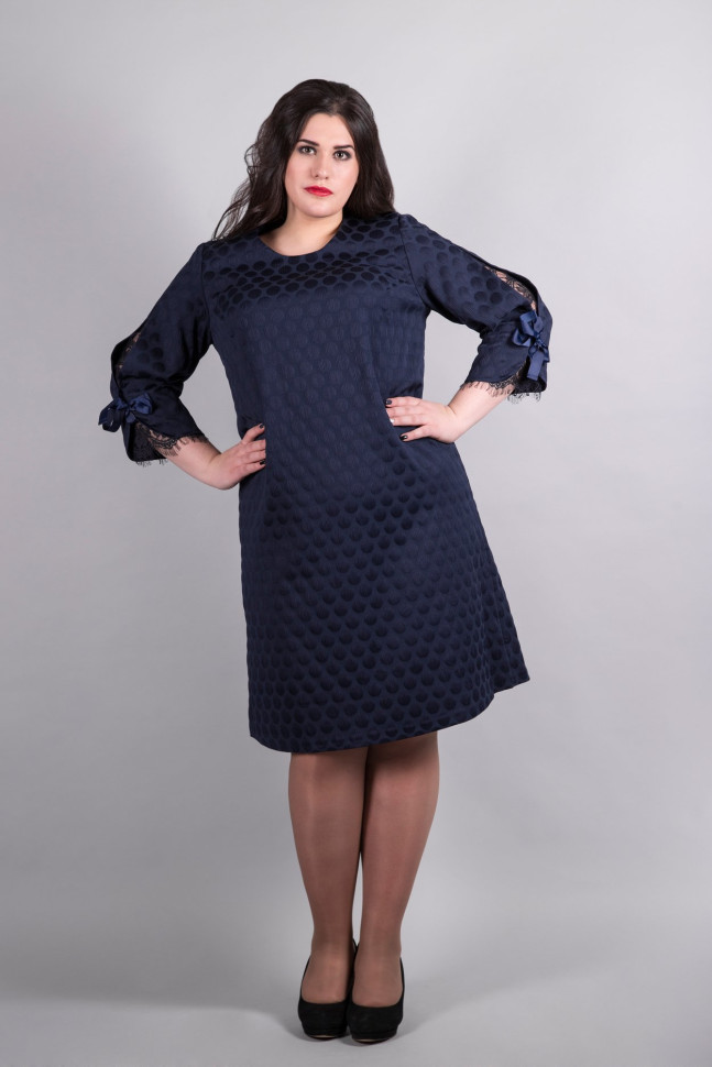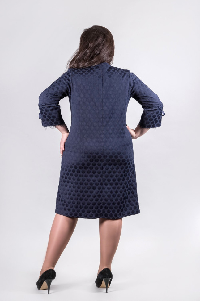 Нарядное платье полуприлегающего силуэта из жаккардовой ткани в крупный горошек. Перед с нагрудными вытачками, спинка со средним швом. Втачные рукава длиной 3/4 с разрезом по центру и бантом из репсовой тесьмы. Внутренние рукава из тонкого кружевного полотна с ресничками. Универсальный темно-синий цвет в сочетании с кружевом и игривым горошком создает нежный и женственный образ. В этом платье первое свидание точно не станет последним. Возьмите с собой жакет 71-030009-253-2 или кардиган 7102-2022.