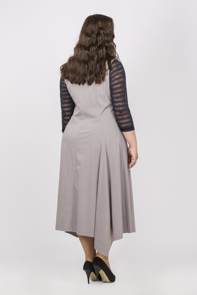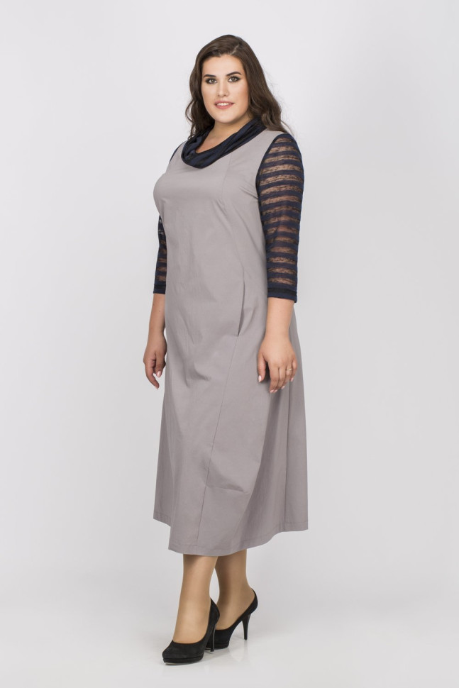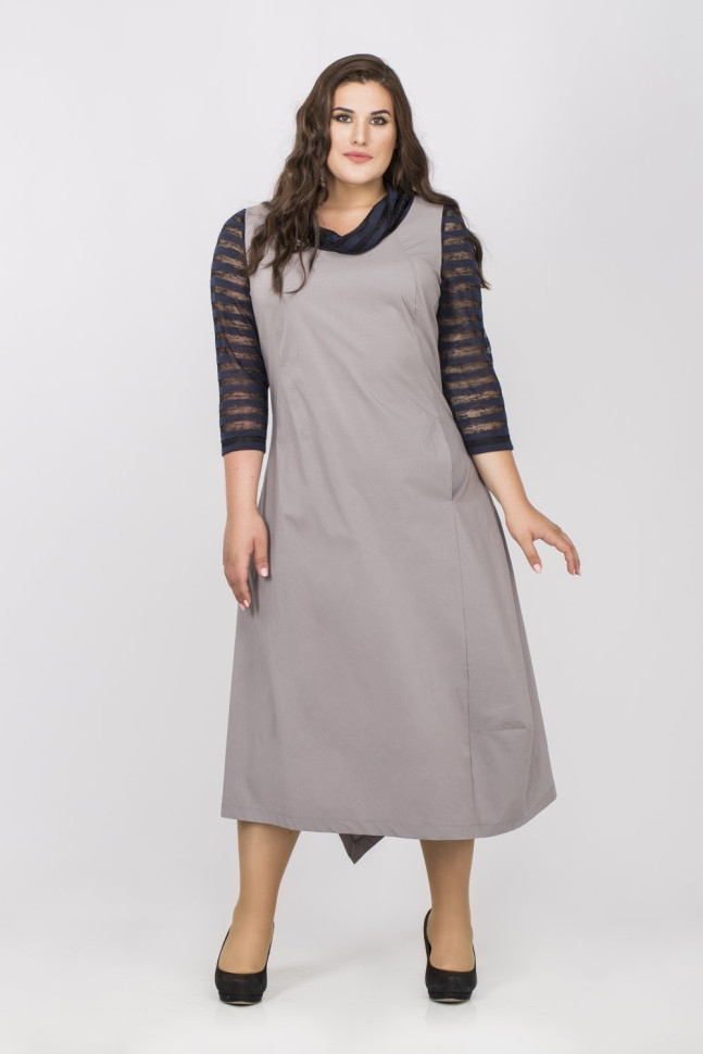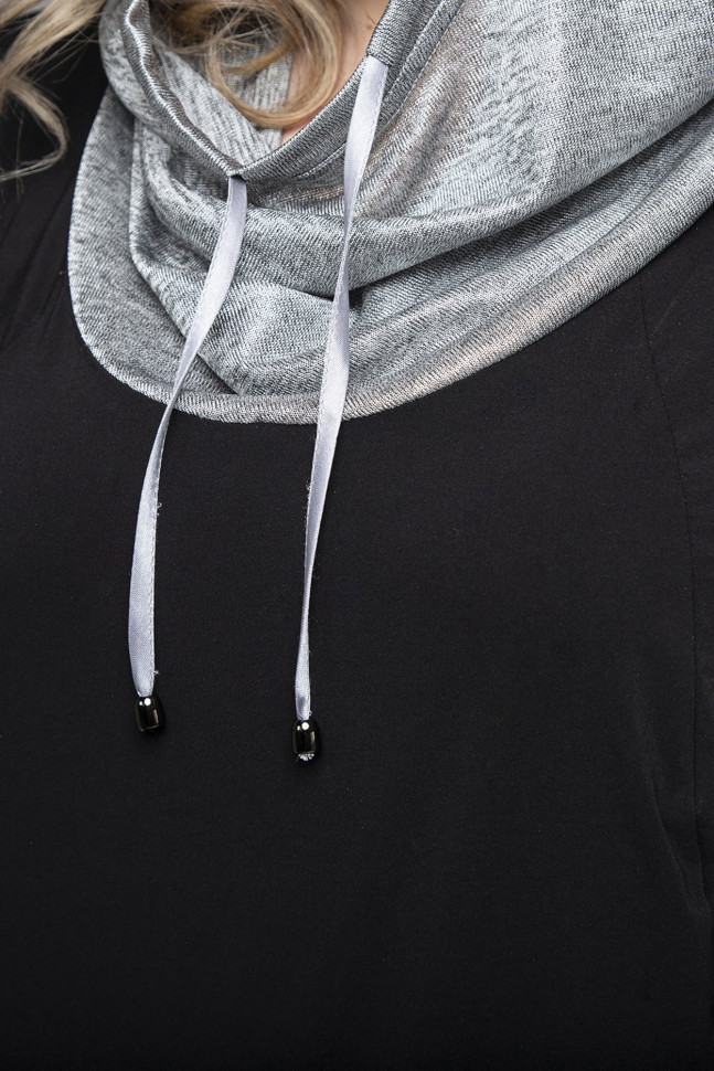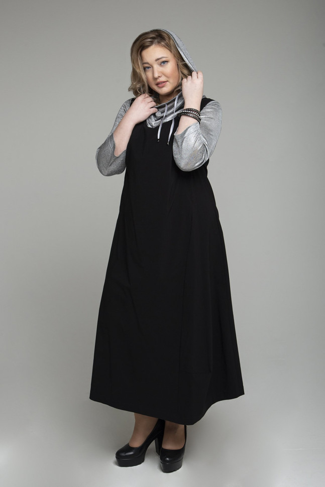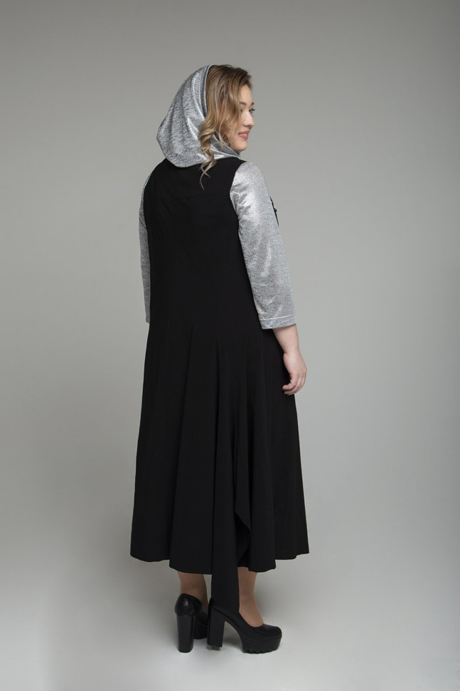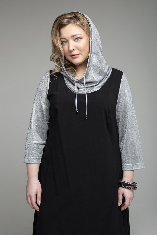 Платье выполнено в двух цветах: Черном и светло-сером. Воротник и капюшон черного варианта выполнены из отделочного трикотажного полотна с серебряным напылением. В серой модели - из отделочного трикотажа в полоску. Низ платья разноуровневый, фигурной формы.
