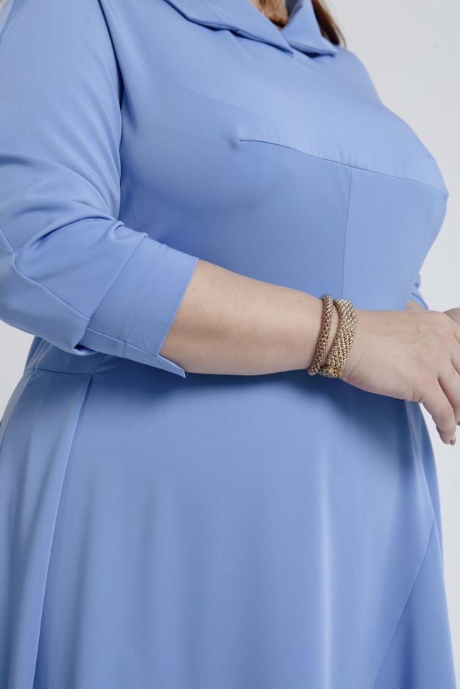 Нежное платье голубого оттенка отличается необычным кроем и женственным шармом. Асимметрия тонкой нитью идёт через всё изделие: воротник, удлинённая спинка рукава и низ отрезной юбки перекликаются между собой и создают интересный эффект. Длина миди, рукав на широкой манжете укорочен. Модель выполнена из плательной ткани, в составе содержит 52% вискозы.