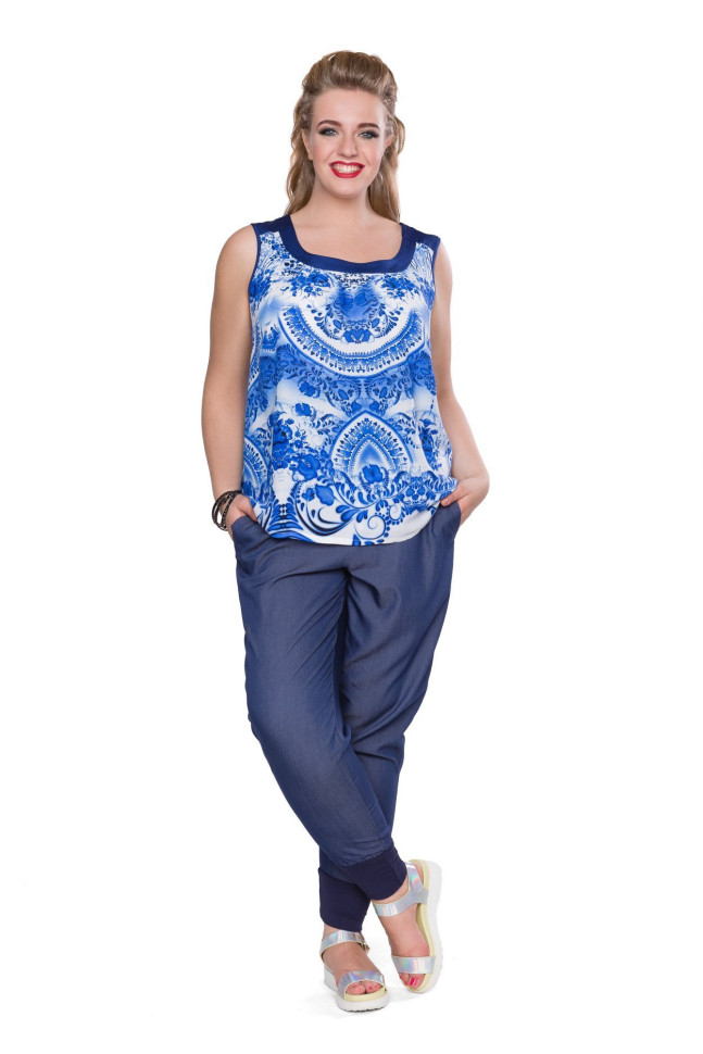 Легкий, слегка расклешенный к низу топ со стилизованным под Гжель принтом. Горловина переда и спинки обработаны однотонными шелковыми планками. Проймы окантованы косой бейкой. Яркое решение для летних образов. Эстетика традионной росписи в современном digital-исполнении. Носите с брюками 171323 или 171392. Дополняйте образ жакетом 71-100001-166