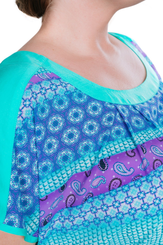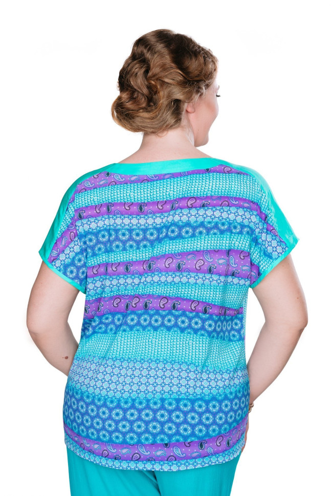 Топ слегка расклешенный к низу. Без воротника, горловина переда и спинки обработаны планками. Спущенное плечо, проймы окантованы косой бейкой. Планки горловины, кокетки переда и спинки выполнены из отделочной ткани.