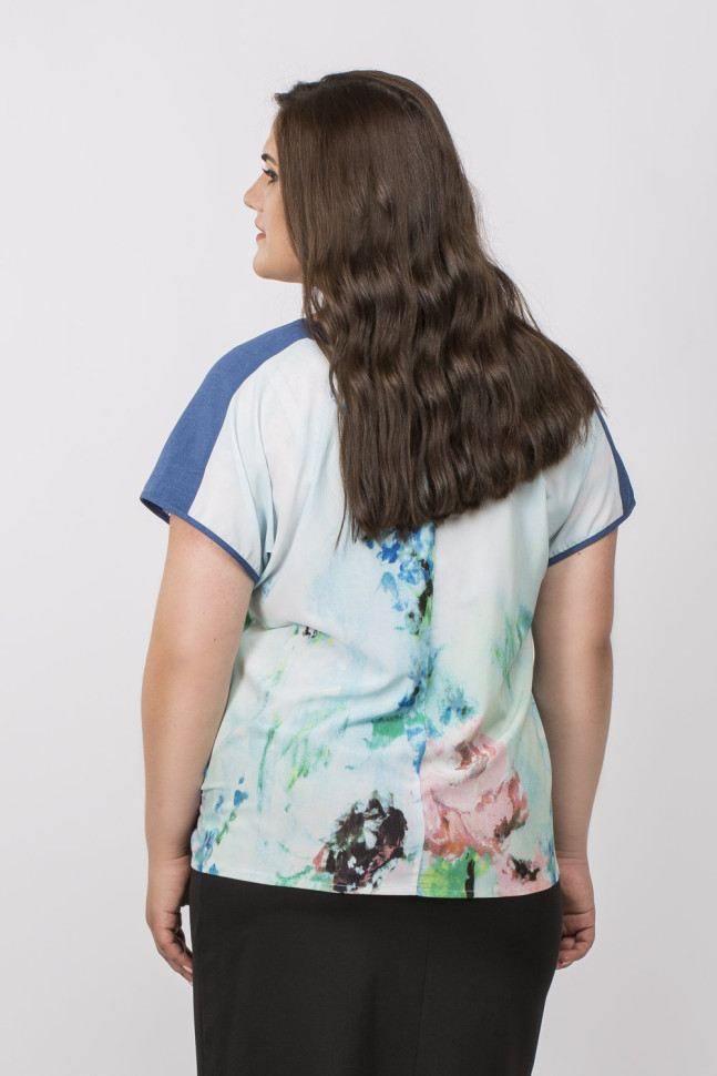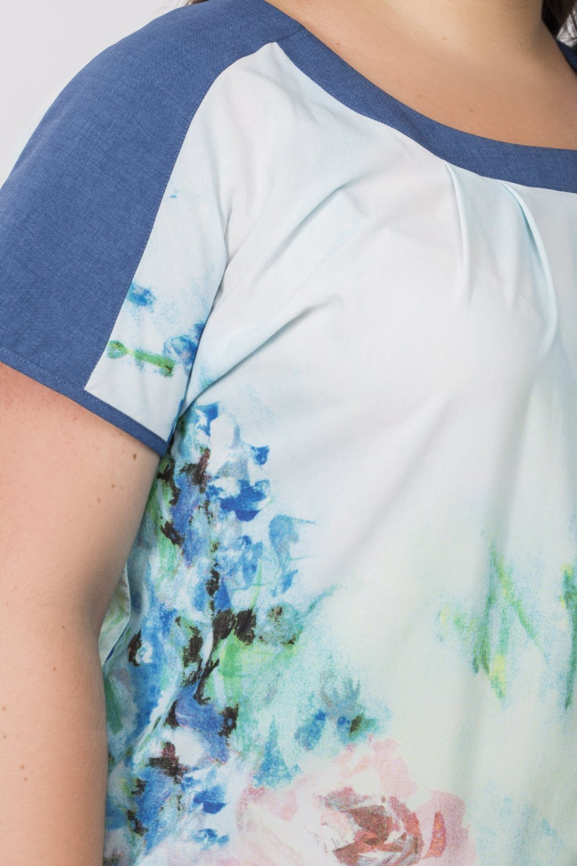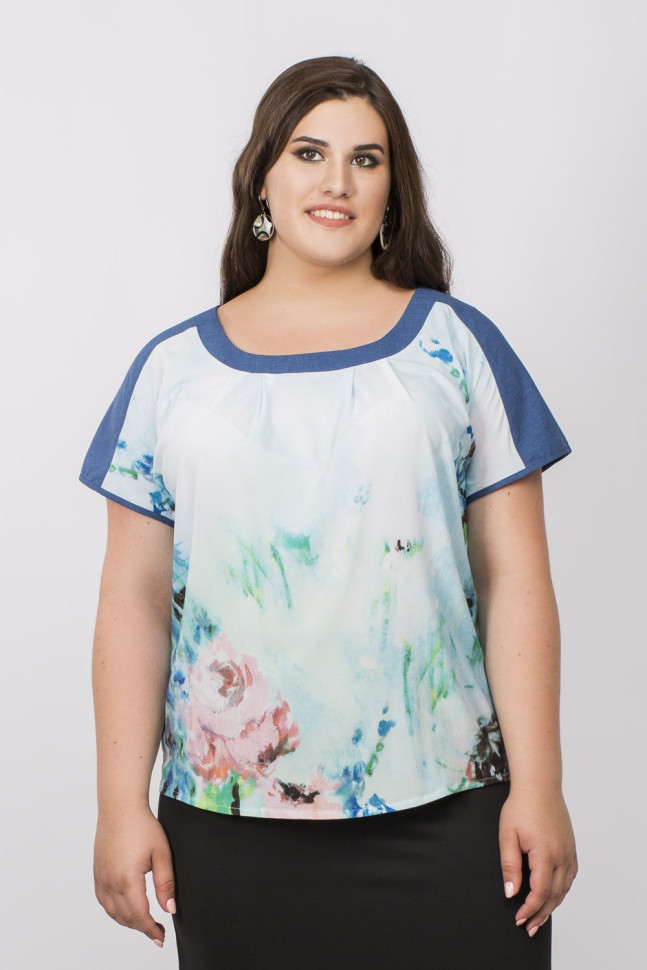 Легкий топ из стрейч-шифона в стиле тургеневской девушки. Широкий овальный вырез горловны оформлен защипами. Короткие рукава на спущенном плече. Низ рукавов, горловина и линия плеч декорированы льняными планками. Нежный романтичный топ составит женственные образы для свиданий с юбками 15L-1-301, 81-040026-379 и 62-040010-124 х