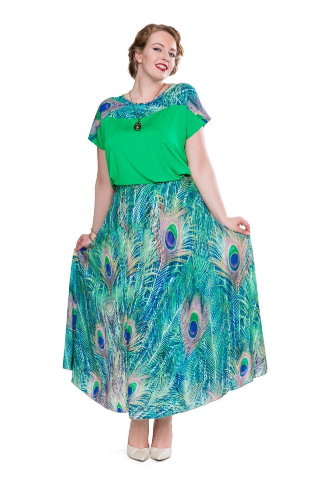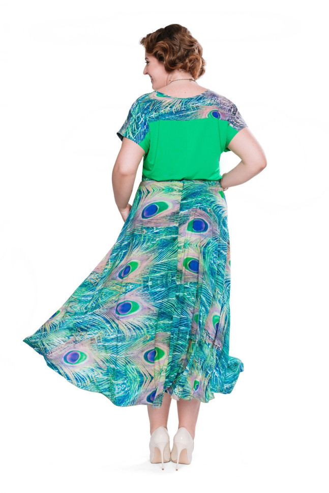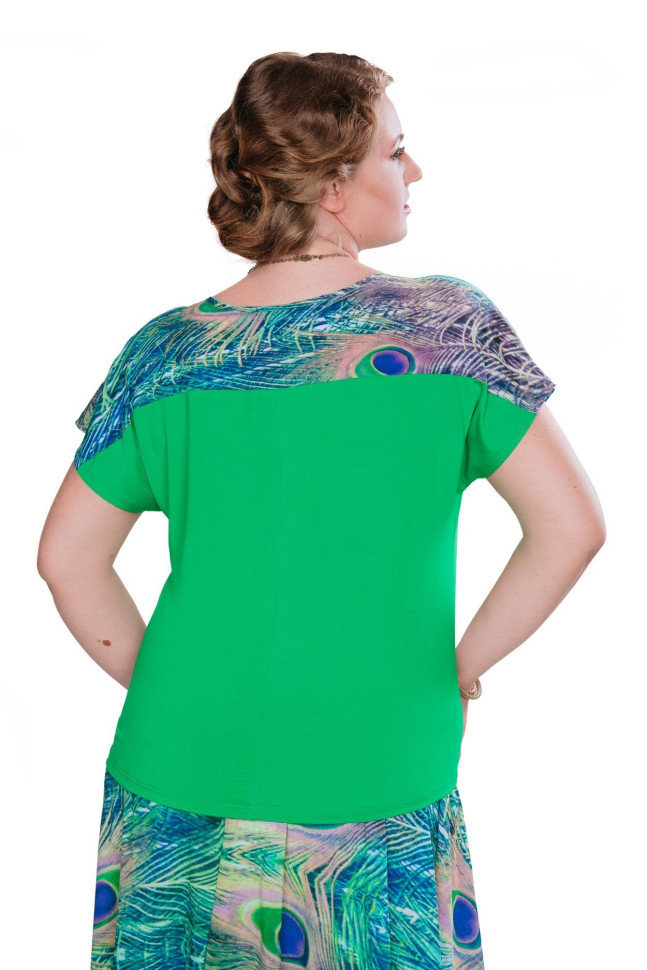 Трикотажный топ сочного зеленого цвета. Кокетки переда и спинки из отделочного стрейч-шифона с принтом в виде перьев павлина. Мягкое спущенное плечо. Круглая плавная горловина. Яркий акцент любого образа. Носите под пиджак, кардиган, блейзер или в качестве самостоятельного верха. Идеальный комплект составит с юбкой 72-040007-026