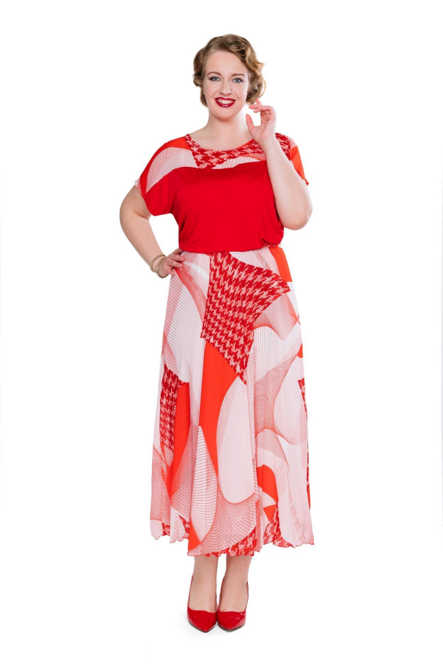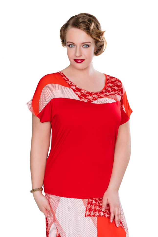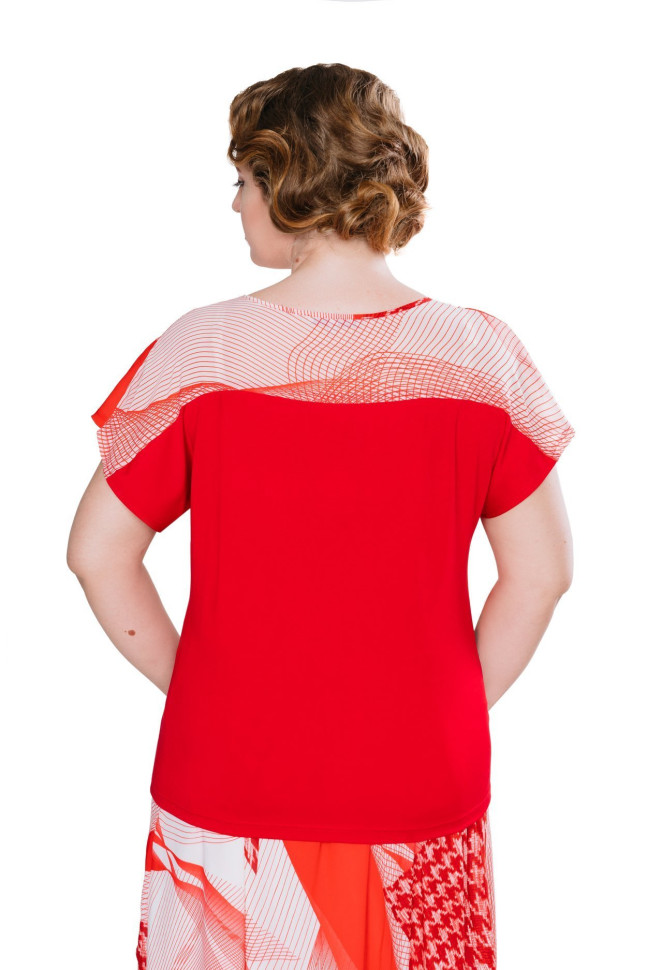 Трикотажный топ насыщенного бордового цвета. Кокетки переда и спинки из отделочного стрейч-шифона с принтом в тон. Мягкое спущенное плечо. Круглая плавная горловина. Яркий акцент любого образа. Носите под пиджак, кардиган, блейзер или в качестве самостоятельного верха. Красный сочетается с черным, белым, синим и их оттенками. Идеальный комплект составит с юбкой 62-040007-009
