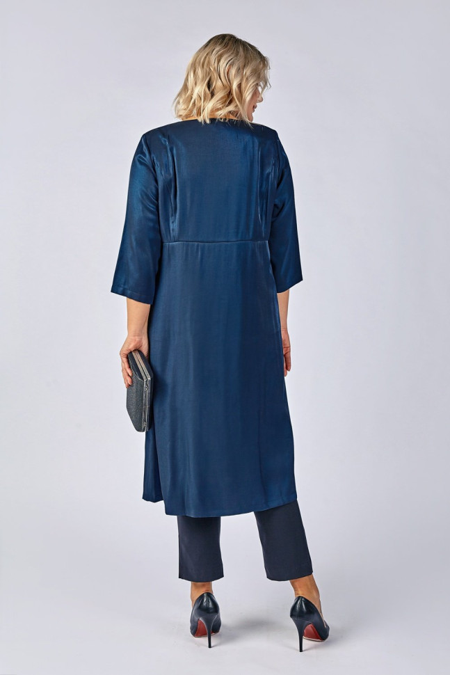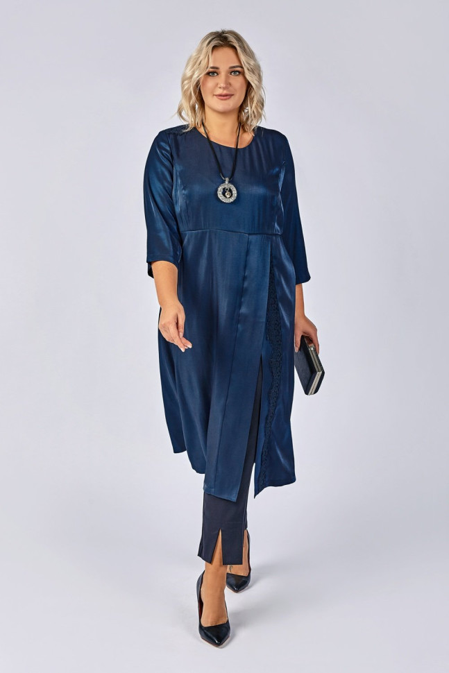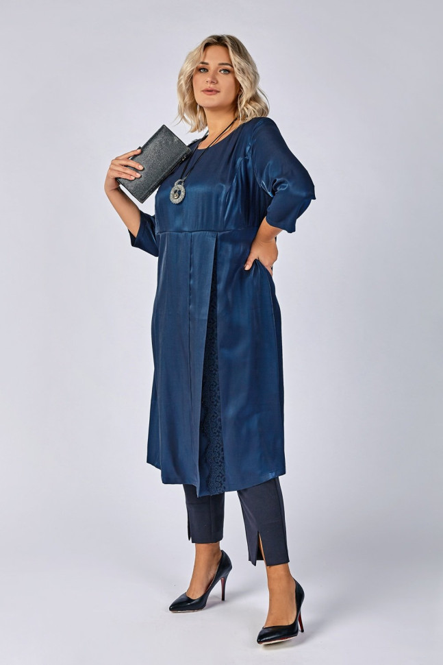 Длинная нарядная туника. Материал мерцает и переливается.Рукав втачной, 3/4. Вырез горловины круглый. Разрез до линии пояса декорирован крежевом. Туника создаст щикарный праздничный образ. Состав 85% Вискоза, 15% Полиэстер