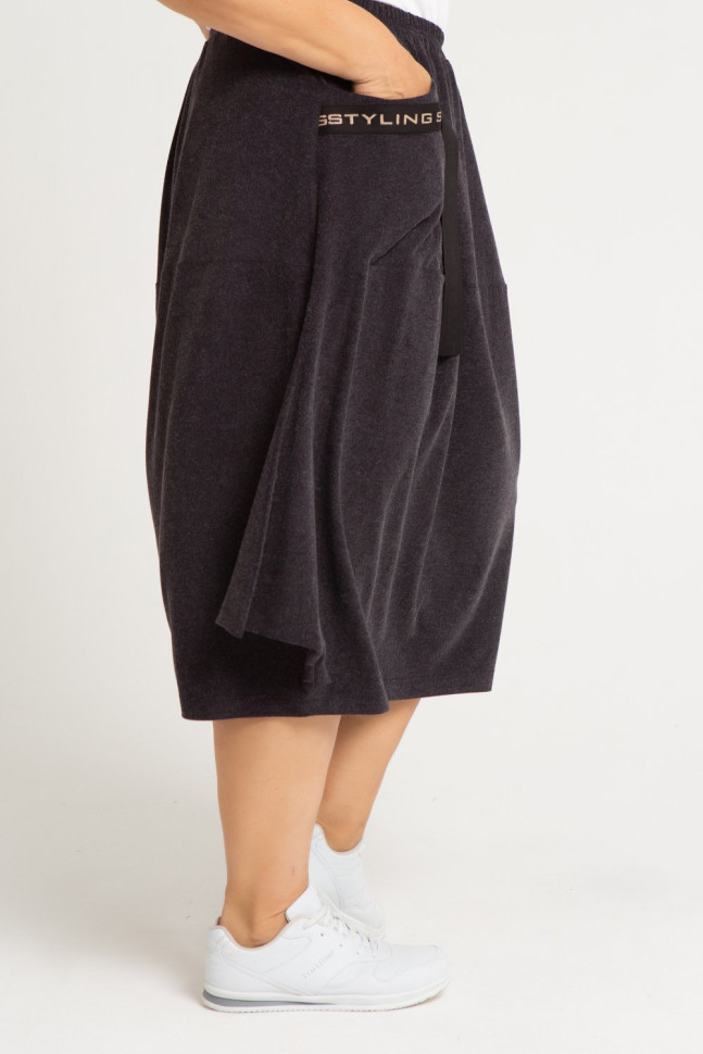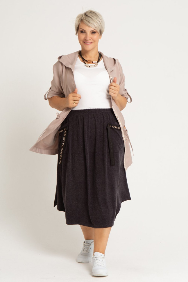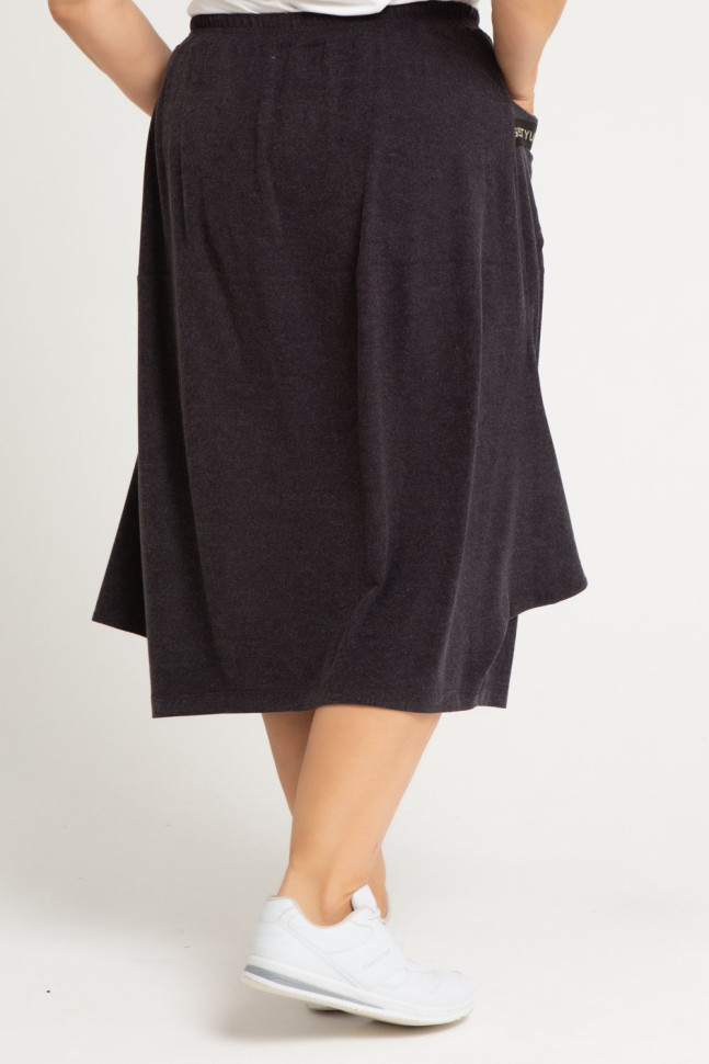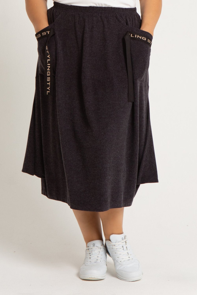 Оригинальная трикотажная юбка. Пластичная фактура ткани легко драпируется, формируя красивые формы складки в боковых швах. Идеальную посадку по линии талии обеспечивает эластичный пояс на резинке. Два накладных кармана декорированы лентами. Практичный и удобный вариант для повседневного стиля. Состав 77% Вискоза, 18%ПЭ, 5%Эластан