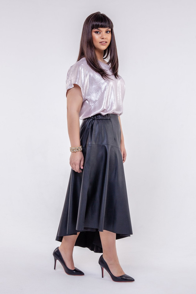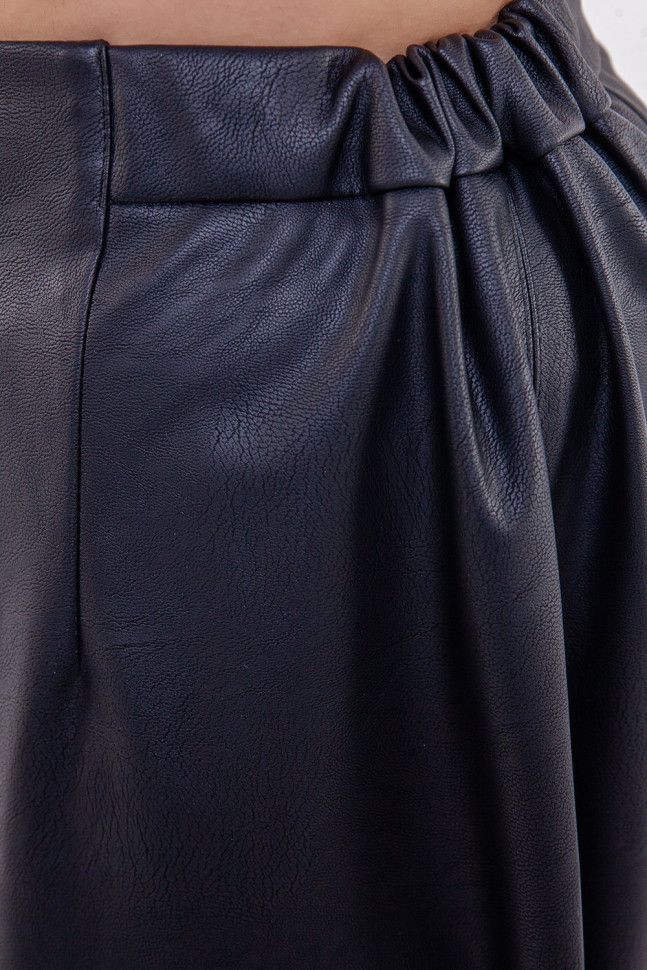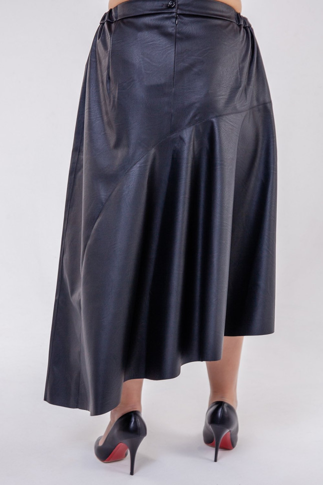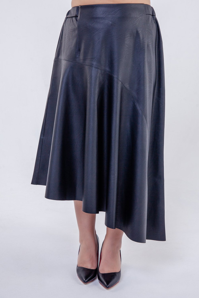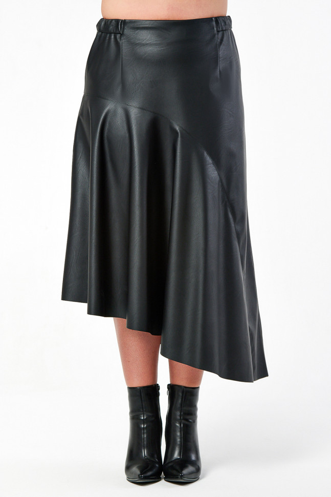 Юбка из эко кожи ассиметричного кроя. По бокам пояса широкая резинка.