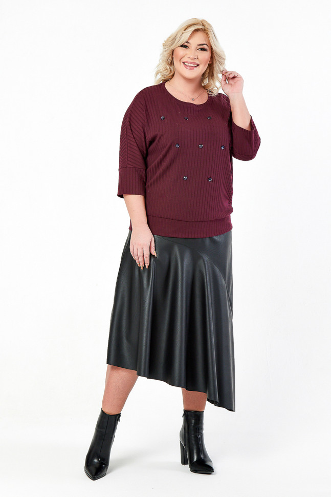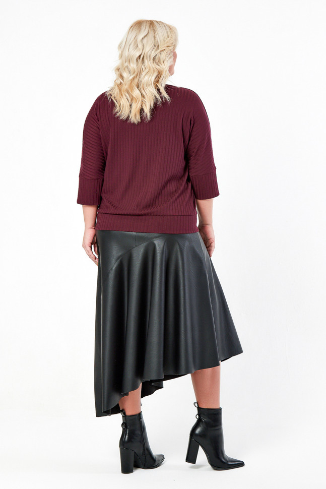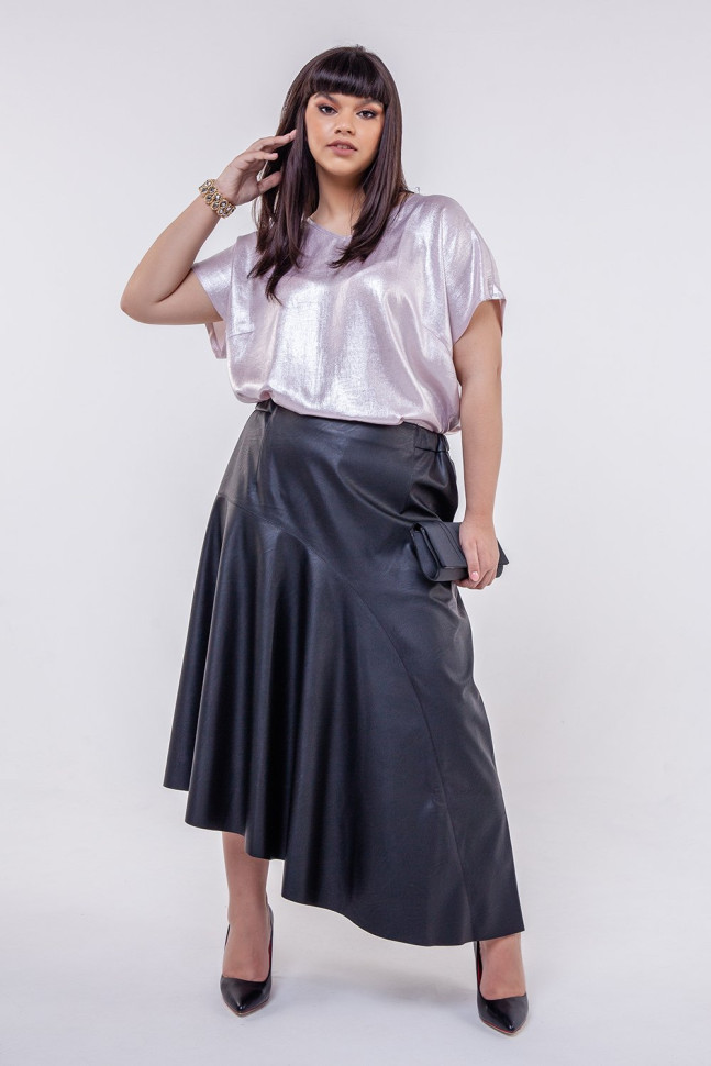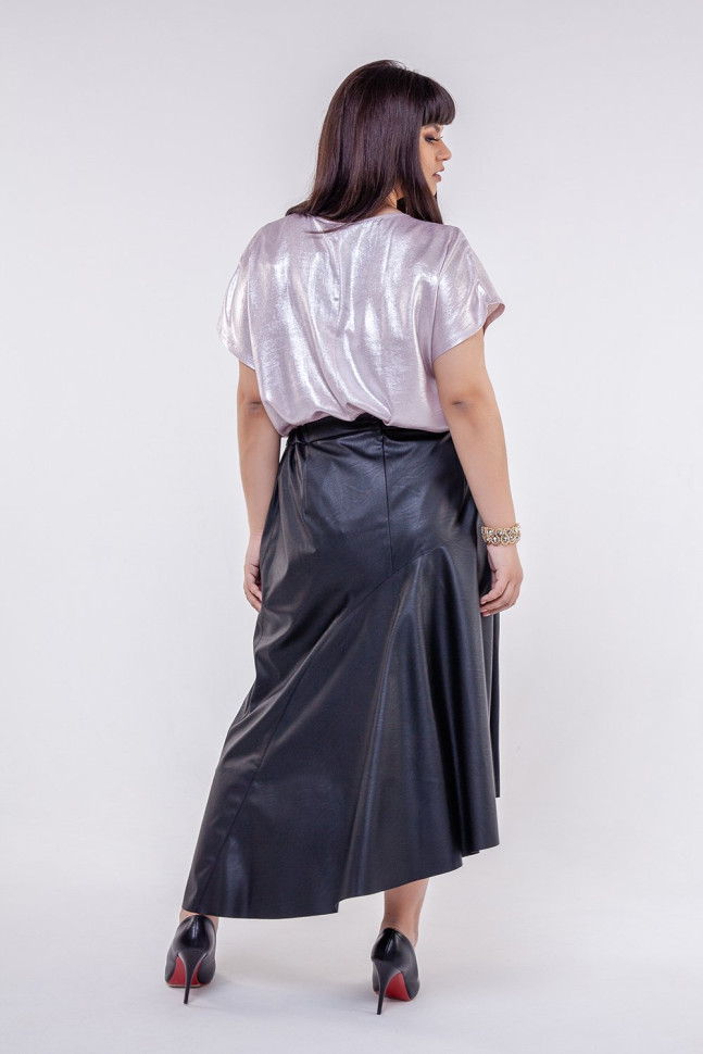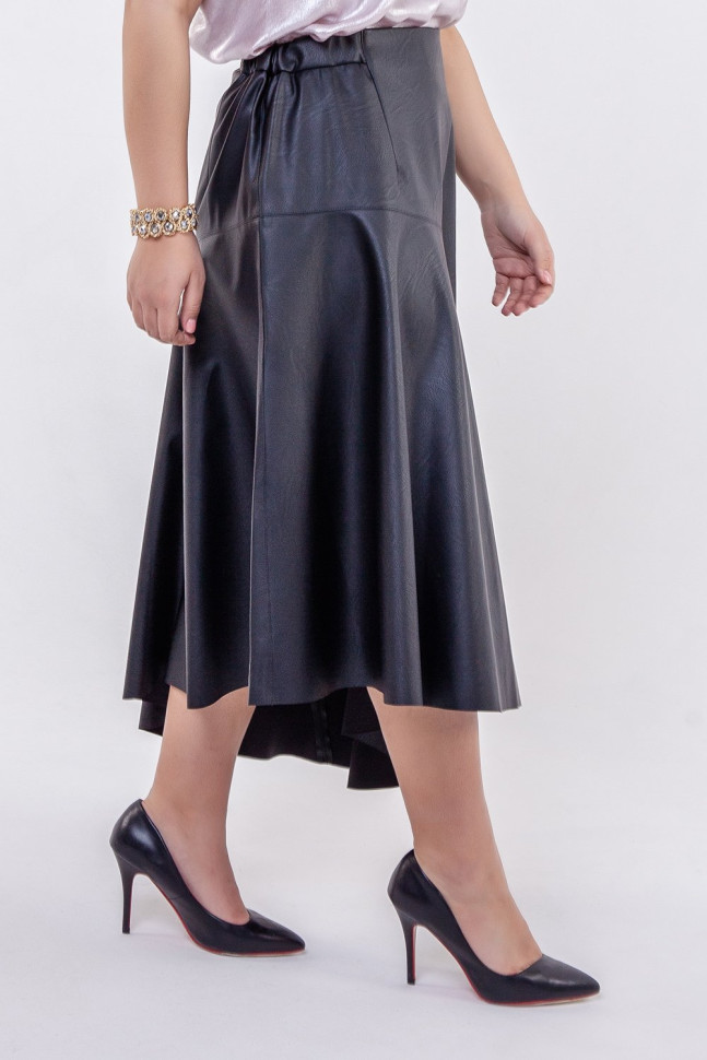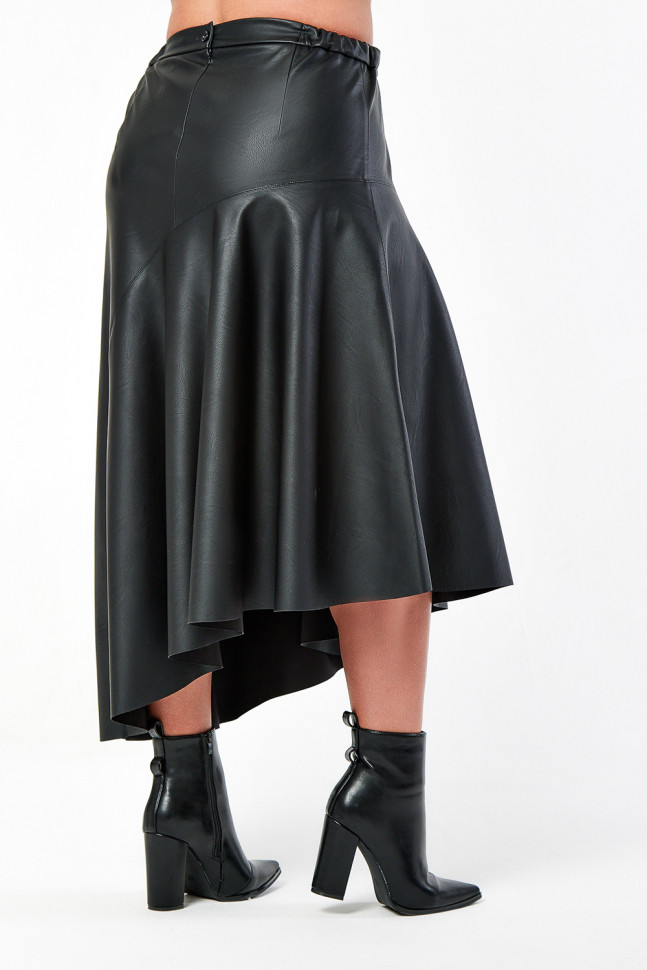Юбка из эко кожи ассиметричного кроя. По бокам пояса широкая резинка.