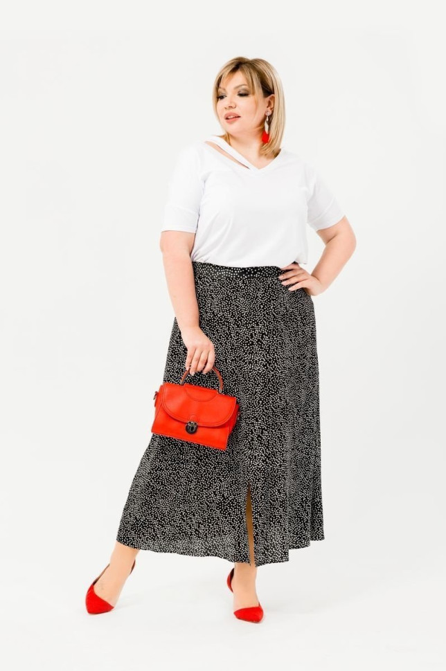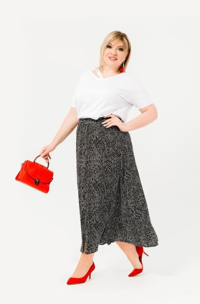 Изделие силуэта "трапеция" выполнено из легкой креповой ткани. Пояс на резинке. По переду разрез.