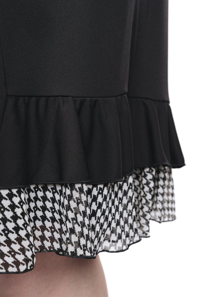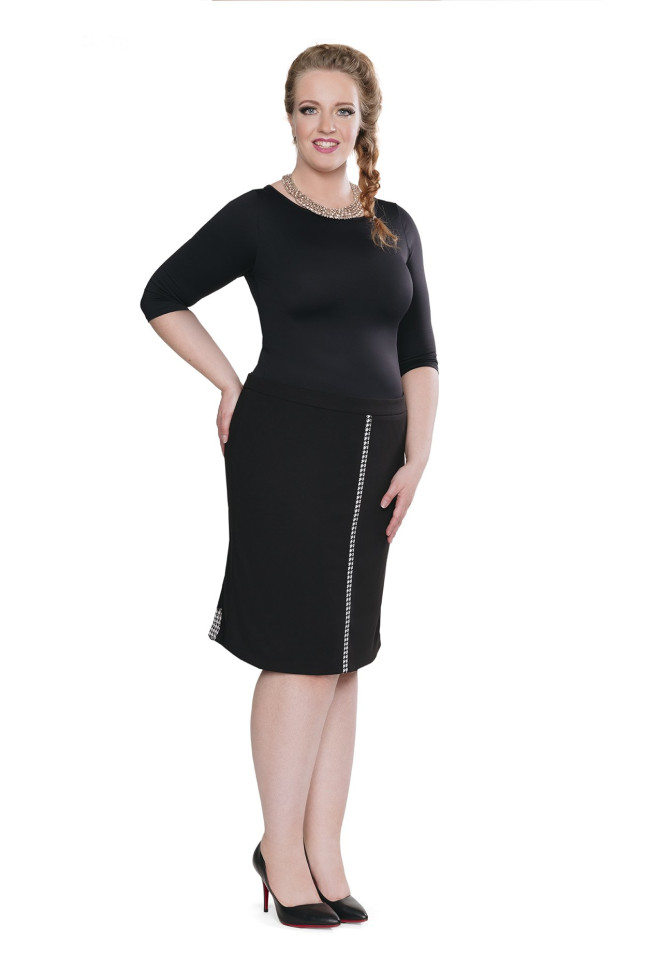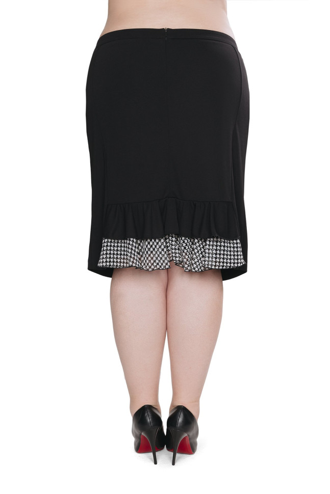 Оригинальное исполнение прямой классической юбки. Изделие выполнено из двух видов тканей: основное полотно - эластичная однотонная вискоза, отделка - шелковистая двуцветная ткань. Отделочной тканью выполнен вертикальный элемент спереди, призванный визуально удлинить силуэт, а также оборка сзади, заканчивающая низ изделия со спины. Модель разнообразит скучные офисные комплекты, не нарушая дресс-код. Носите с блузами 26/41718 и 1488