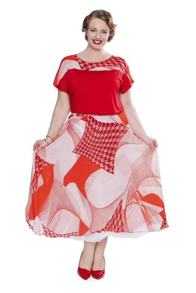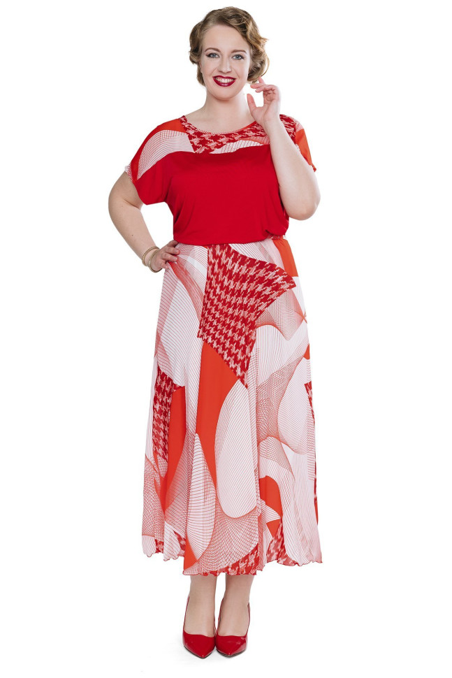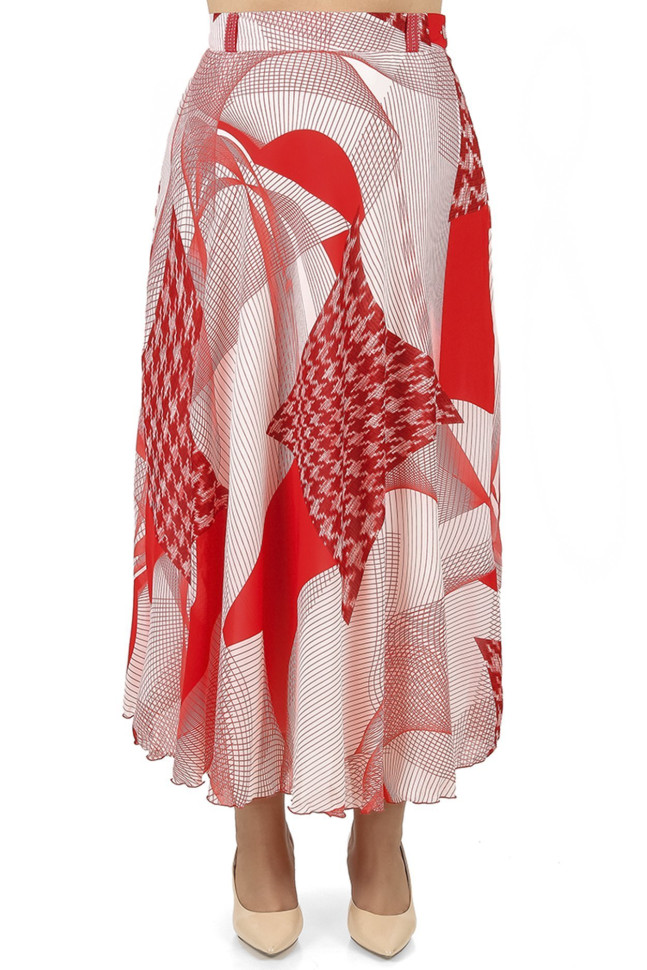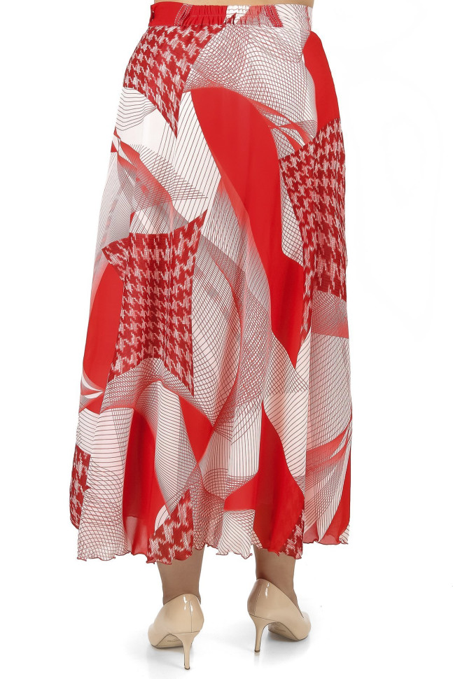 Эффектная юбка миди, расклешенная книзу. Узор модели выполнен в стиле пэчворк из трикотажной ткани. Создаст нежный образ в сочетании с яркими однотонными блузами. Притачной пояс имеет шлевки под ремень с резинкой на спинке, для удобной посадки на талии. Застежка-молния выполнена в боковом шве с пуговицей на поясе. Юбка отлично подойдет для повседневной носки.