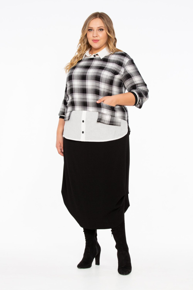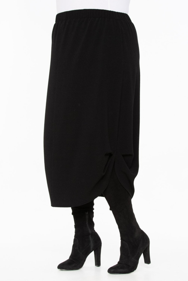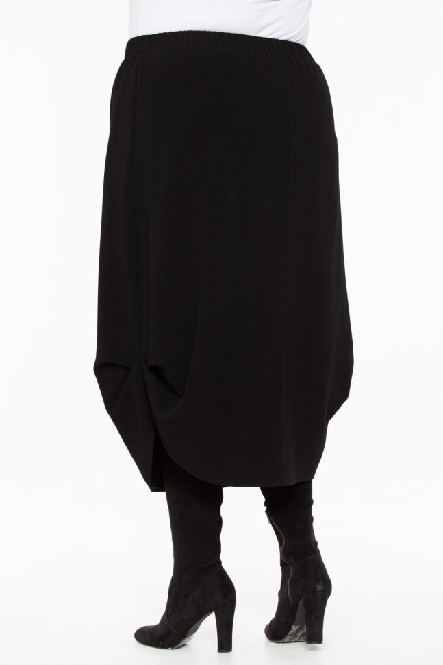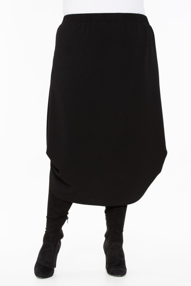 Оригинальная длинная юбка-баллон из зернистого черного крепа. Пластичная фактура ткани легко драпируется, формируя красивые формы складки в боковых швах. Идеальную посадку по линии талии обеспечивает эластичный пояс на резинке. Перед и спинка юбки со средним швом, отстроченным декоративными нитками, визуально «собирающим» и вытягивающем силуэт. Модель без застежки и без подкладки.