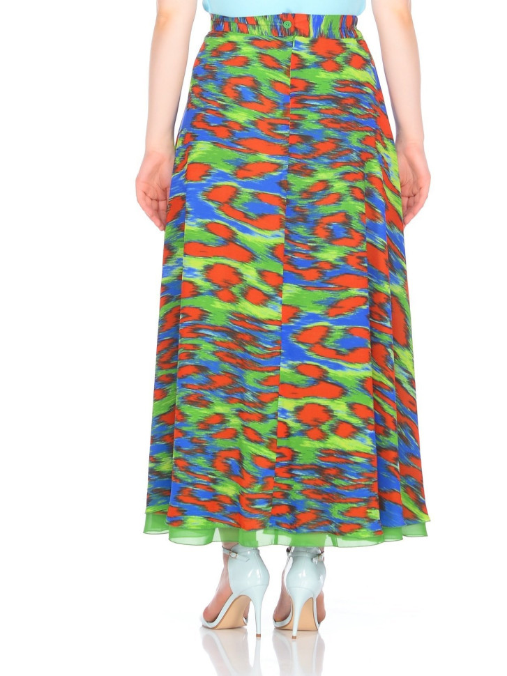Двухслойная юбка-клеш из шифона длиной до середины икры. Верхняя юбка из шифона со звериным принтом в необычных цветах, со скошенной линией низа. Нижняя юбка из однотонного мульти-шифона. Притачной пояс застегивается на одну пуговицу и регулируется резинкой на спинке. В среднем шве спинки скрыта застежка-молния.