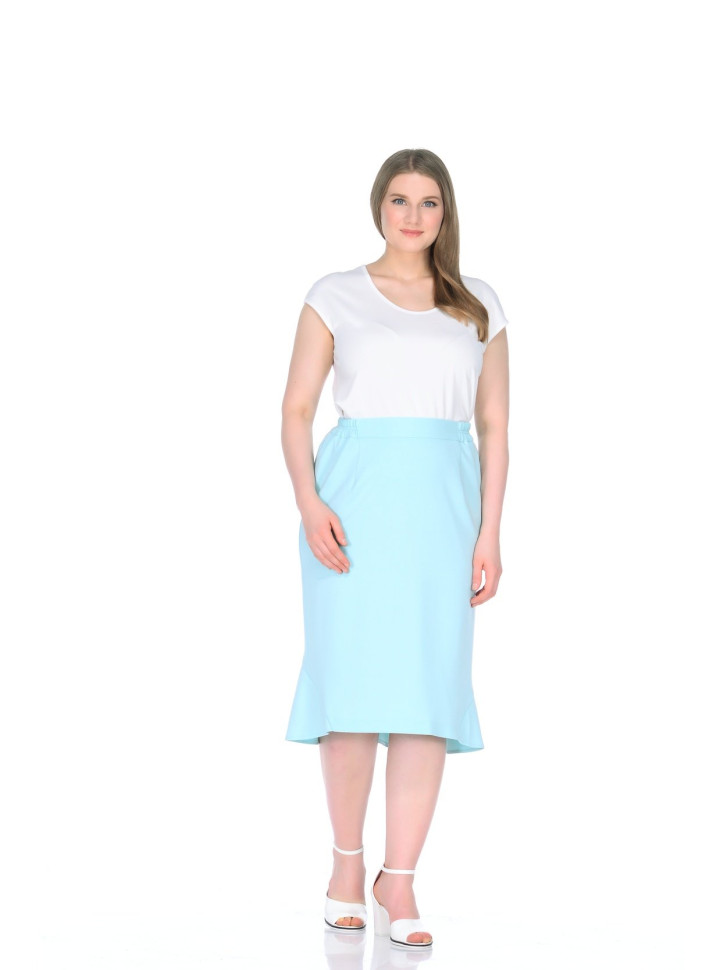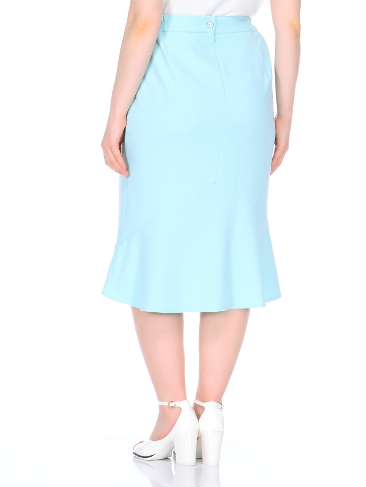 Юбка из костюмной ткани на подкладке с талиевыми вытачками. Пояс с резинками по бокам застегивается на 1 пуговицу. Потайная застежка-молния расположена в среднем шве спинки, который заканчивается неглубокой шлицей. В нижней части спинки волан фигурной формы, плавно переходящий на перед.